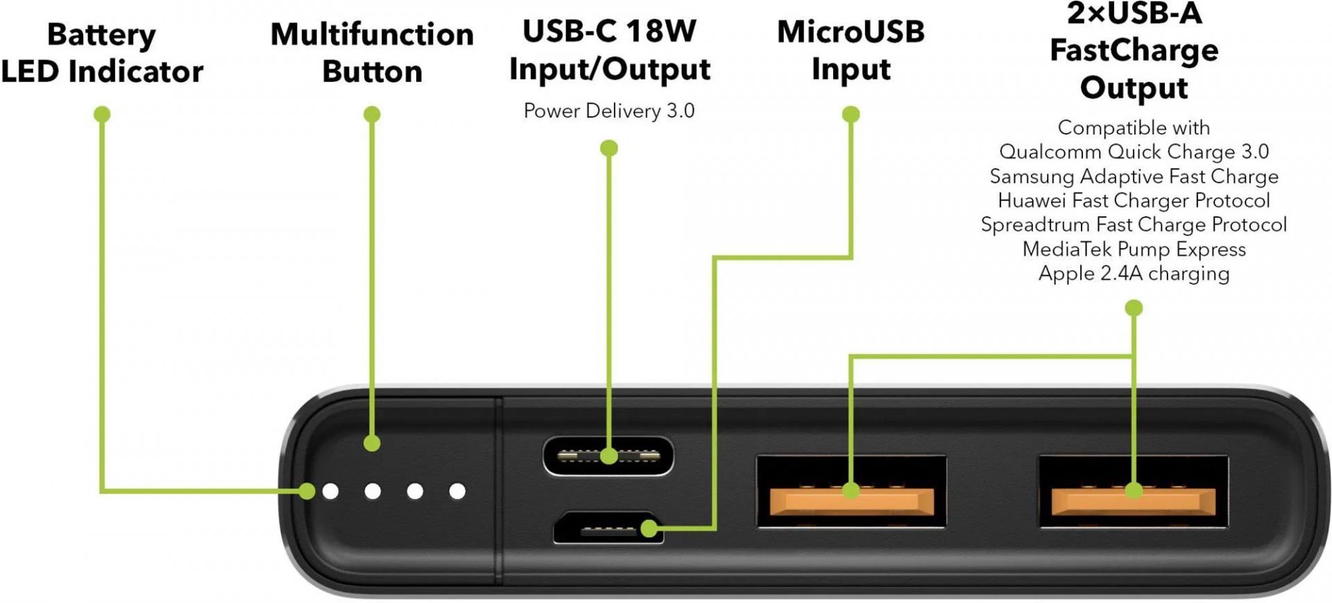 - Má kovové tělo, kapacitu 10000 mAh a podporu pro různé standardy rychlého nabíjení