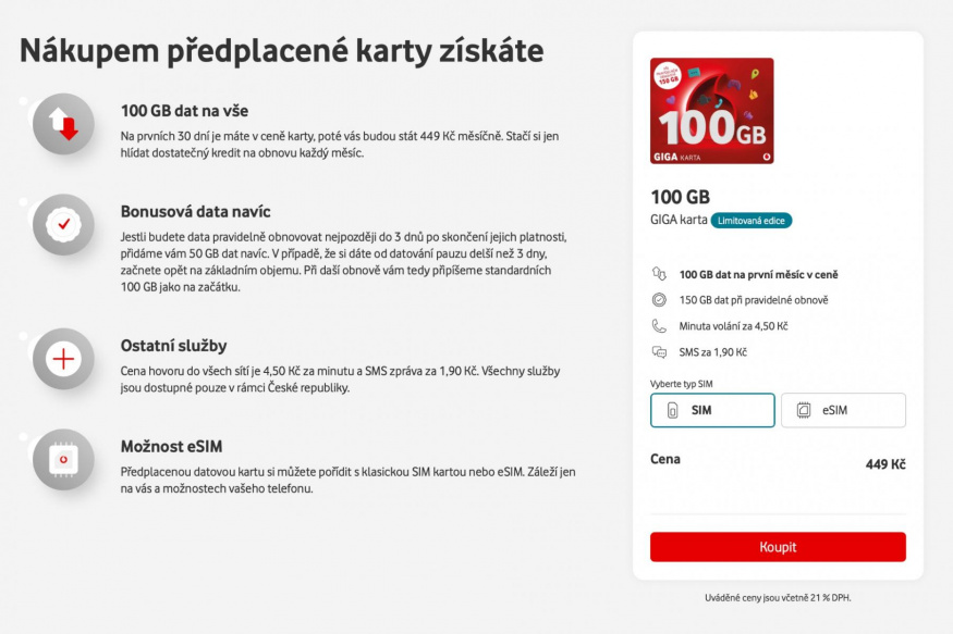 GIGA karta, jak zní název předplacené SIMky od Vodafonu, nabízí v základu 100GB datový balíček, který je pravidelně obnovován každý měsíc. Cena karty je 449 korun a dostupná je od 2. prosince na zatím nespecifikovaný časový horizont, pravděpodobně však jen do konce měsíce.