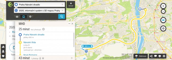 2GIS je jedním z nejdetailnějších geoinformačních systému v Praze. Nabízí více než 70 000 záznamů o nejrůznějších místech, mobilní aplikaci i pokročilé plánování tras včetně MHD.