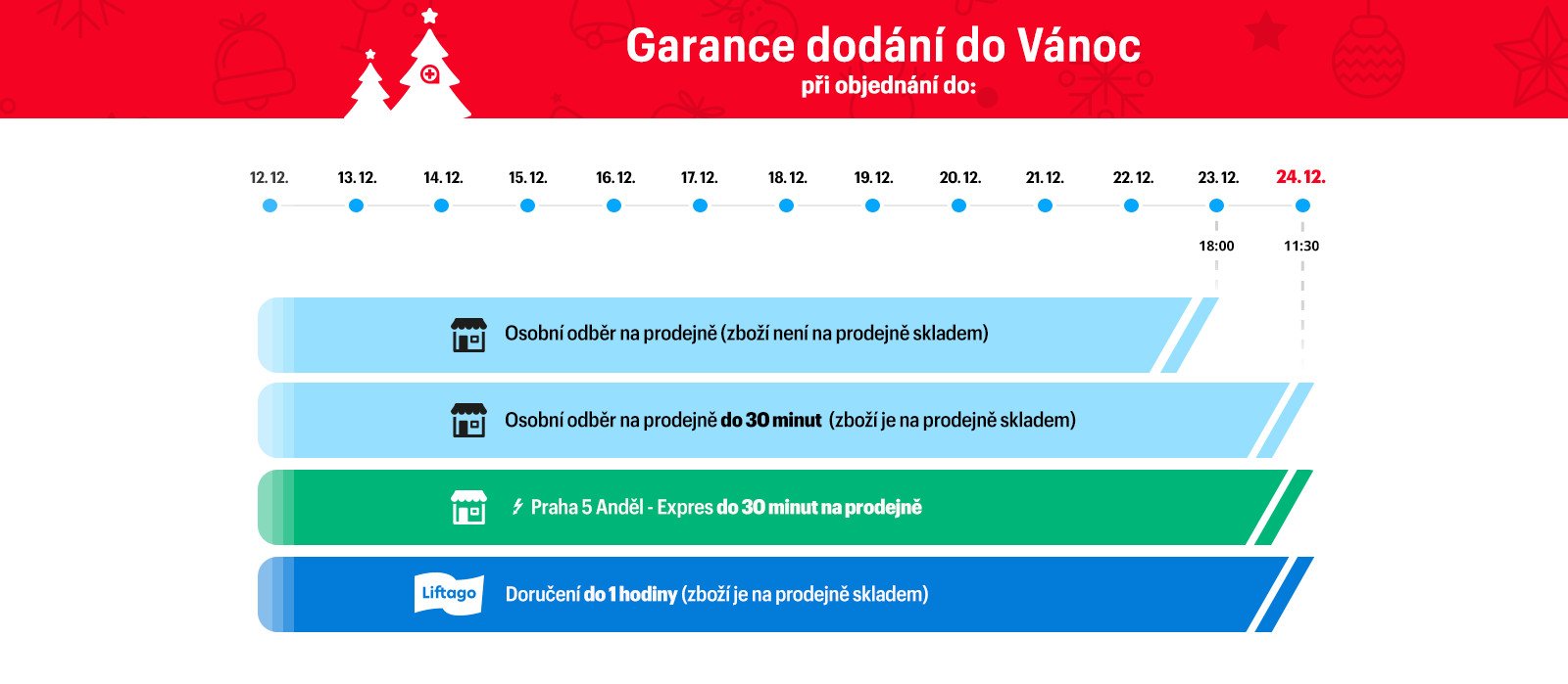 Stačí využít osobní odběr na prodejně nebo ve vybraných městech expresní doručení do 1 hodiny skrze Liftago. Mobil Pohotovost má všech svých 13 prodejen otevřených i na Štědrý den, a to do 12:00. Více vám již prozradí níže uvedená infografika.