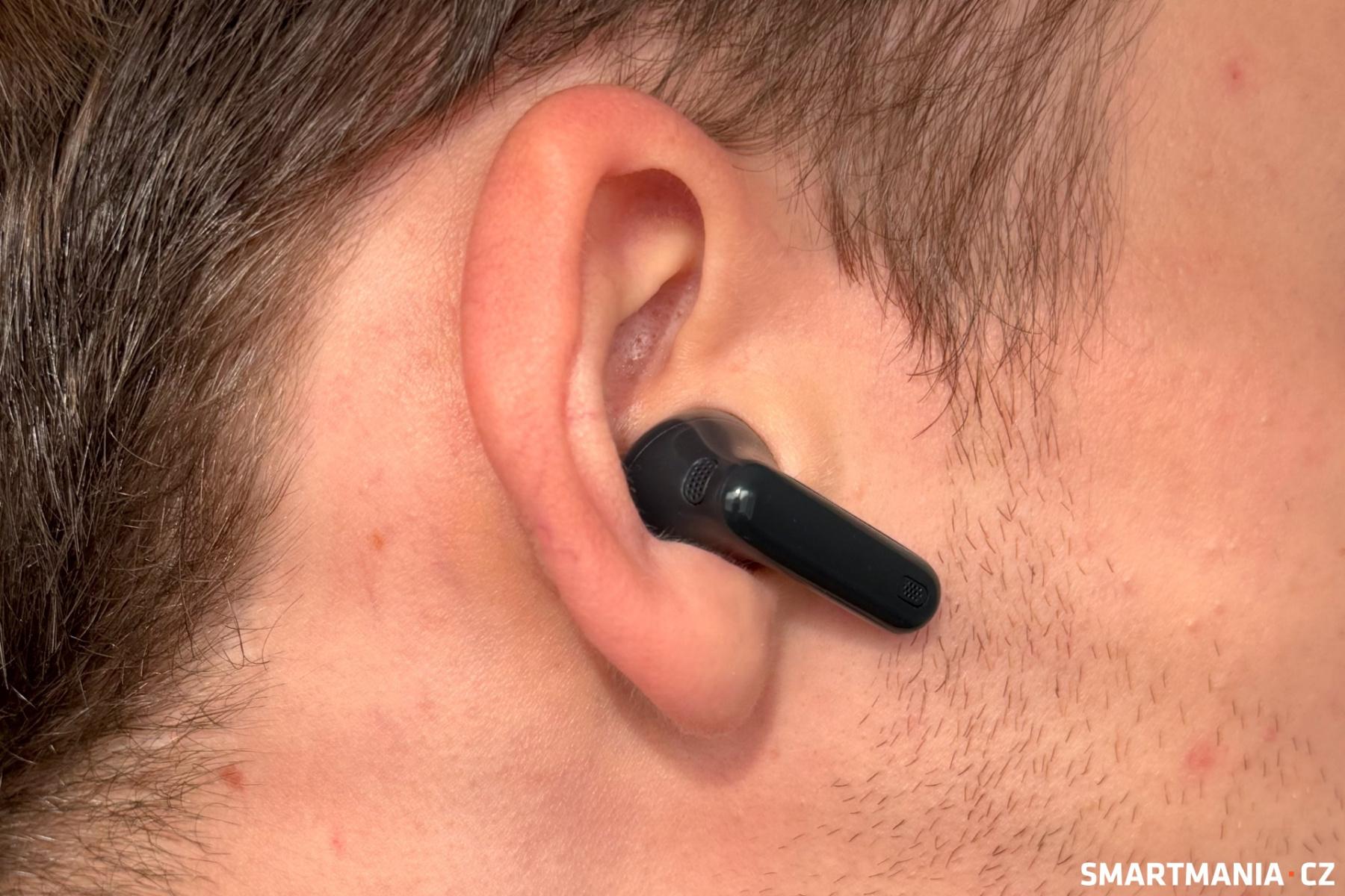 Hlavička má mírně vypouklý povrch, takže se hezky opírá o ušní výběžek – tzv. kozlík – a sluchátka držela bez nutnosti neustálého upravování. V praxi funguje tento koncept skvěle. Sluchátka zůstávají na místě i při běhu, chůzi nebo při žvýkání a po několika hodinách používání nepůsobí tlak ani diskomfort.