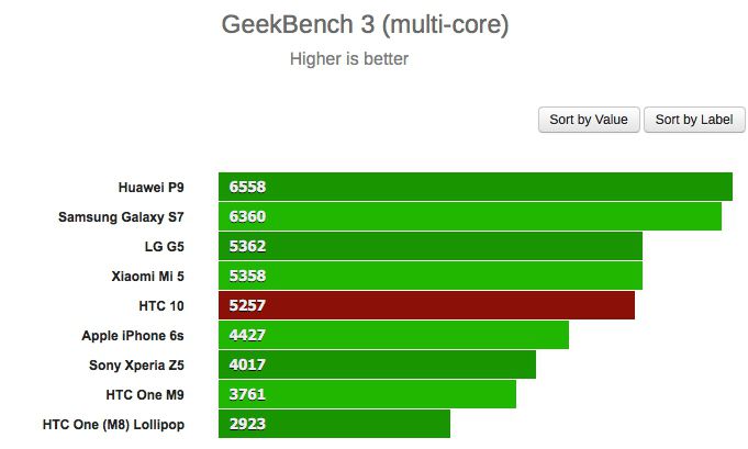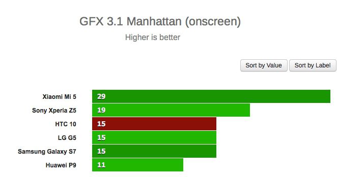 HTC 10 se nicméně zaskvělo v offscreen testech v GFX Manhattan, v onscreen testech jej však předběhly smartphony s nižším rozlišením displeje – iPhone 6s, Xiaomi Mi 5 a Xperia Z5.