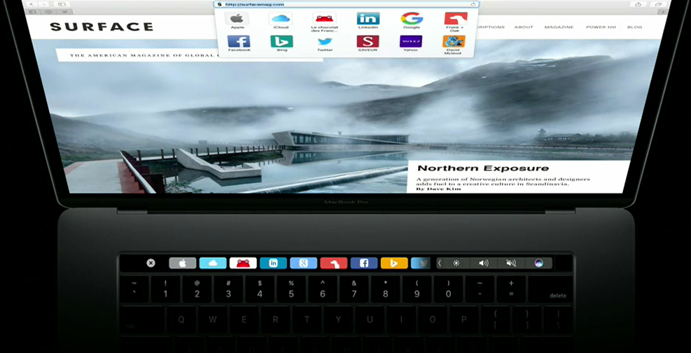 Tlačítka v Touch Baru se mění podle toho, jakou aplikaci zrovna používáte. Prohlížeč Safari vám například nabídne vaše oblíbené stránky, aplikace Mail tlačítka pro přeposílání pošty, její označování vlaječkou, vyhledávání apod. Touch Bar pomáhá i s psaním na klasické mechanické klávesnici – nabízí návrhy slov, lze odsud měnit formát písma (tlusté, kurzíva, barva), dokonce lze z TouchBaru vybírat smajlíky.