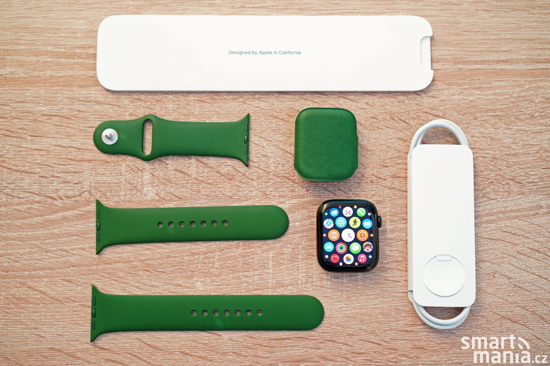 Ve větší krabičce pak dále najdete uživatelské příručky a metr dlouhý kabel s novým dokovacím pukem pro nabíjení a koncovkou USB-C na druhém konci. V tenčí krabičce se ukrývají dva řemínky ve velikosti S/M a M/L. V našem případě je pásek sportovní – antialergický fluoroelastomerový (FKM) řemínek.