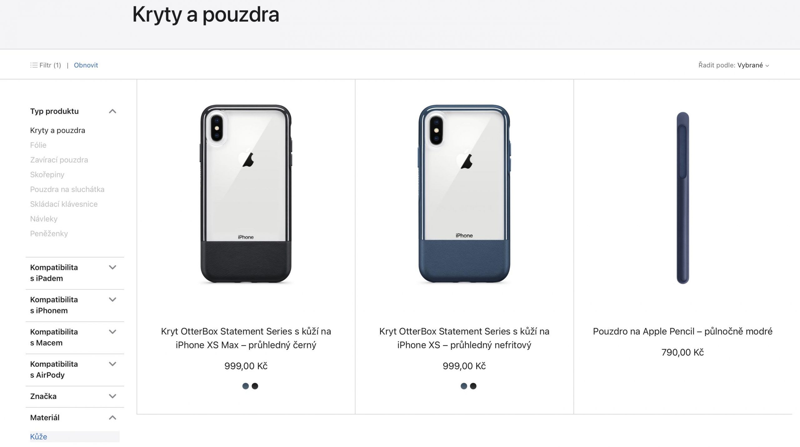 Nic takového už na oficiálním e-shopu nenajdete. Americký e-shop Applu dokonce ve filtraci produktů nenabízí položku kůže, pouze veganská kůže – a ani těchto produktů tam není zrovna hodně. Česká mutace stále disponuje možností vyfiltrovat produkty z kůže, v celém e-shopu jsou však pouze tři konkrétní produkty: dva kryty OtterBox pro iPhone XS (Max) a kožené pouzdro na Apple Pencil.