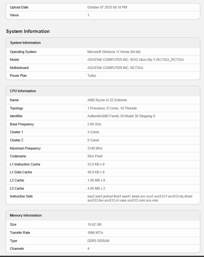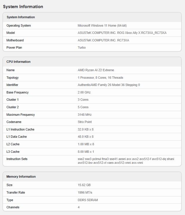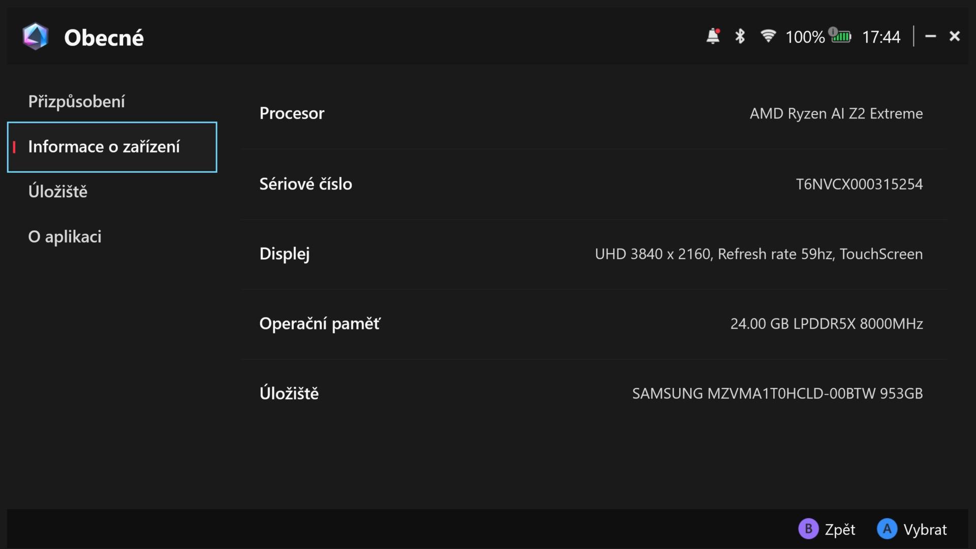 Hlavním tahákem z hlediska výkonu je procesor AMD Ryzen AI Z2 Extreme taktovaný na 2 GHz (24 Mb Cache, možnost přetaktování až na 5 GHz, 8 jader, 16 vláken), kterému sekunduje AMD XDNA NPU s až 50 TOPS a grafikou AMD Radeon. Nechybí ani 24 GB LPDDR5X RAM (k dispozici je okolo 15 GB) a 1TB úložiště PCIe 4.0 NVMe M.2 SSD (2280) s možností rozšíření o microSD karty. Co se týče výkonu, v benchmarku GeekBench 6 získal handheld 2036 bodů na jednom jádru, 10056 bodů na více jádrech a 37367 bodů na grafice. Problém nebyl ani s přehříváním, ačkoli se teplota zařízení při hraní náročnějších her pohybovala i okolo 80°C, díky spolehlivému chlazení se totiž vždy velmi rychle dostala na příznivější hodnoty.