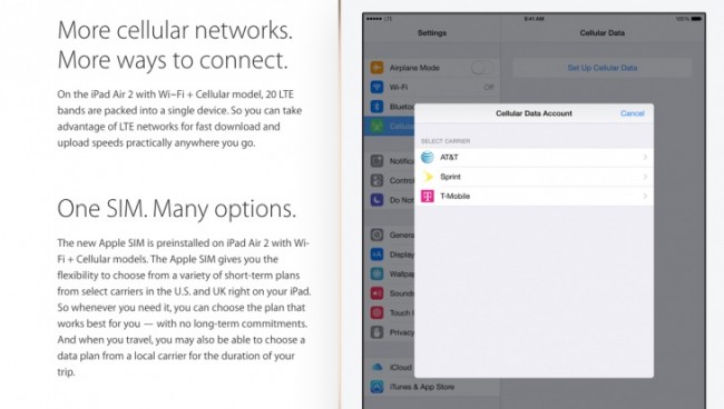 Včera představený iPad Air 2 (Wi-Fi + Cellular) bude na americký a britský trh dodáván s předinstalovanou kartou Apple SIM. Tato karta je univerzální pro použití u více operátorů, aktuálně má Apple nasmlouvanou čtveřici AT&T, Sprint, T-Mobile a EE. Díky této funkci bude možné si dynamicky vybírat aktuálně nejvýhodnější datové balíčky nejen v rámci portfolia vašeho operátora, ale i v nabídkách jeho konkurentů; a to vše bez nutnosti vyměňovat SIM kartu.