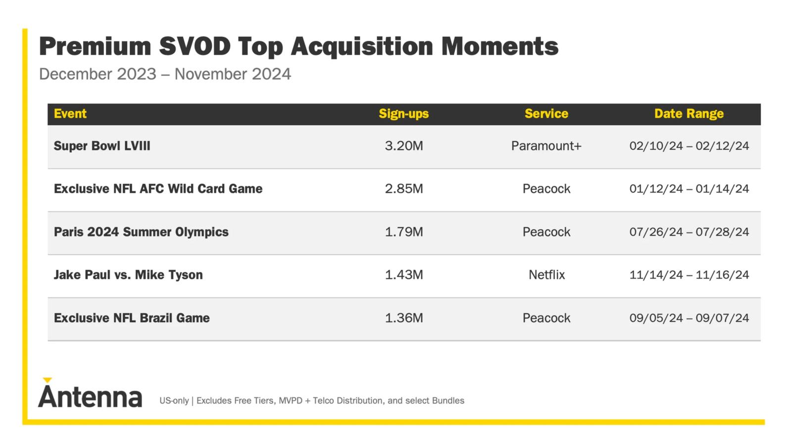 Streamovací služby ve sportovních přenosech evidentně vidí způsob k rychlému zbohatnutí. Kromě Netflixu přilákal Paramount Plus nejvíce předplatitelů v době loňského Super Bowlu LVII, kdy podle údajů Antenny došlo v souvislosti s tímto vysoce sledovaným zápasem k nárůstu počtu registrací o 3,2 milionu. Služba Peacock také zaznamenala výrazný nárůst, když vysílala sportovní utkání NFL AFC Wild Card Game, a velký nárůst zaregistrovala i v prvních dnech letních olympijských her v Paříži.