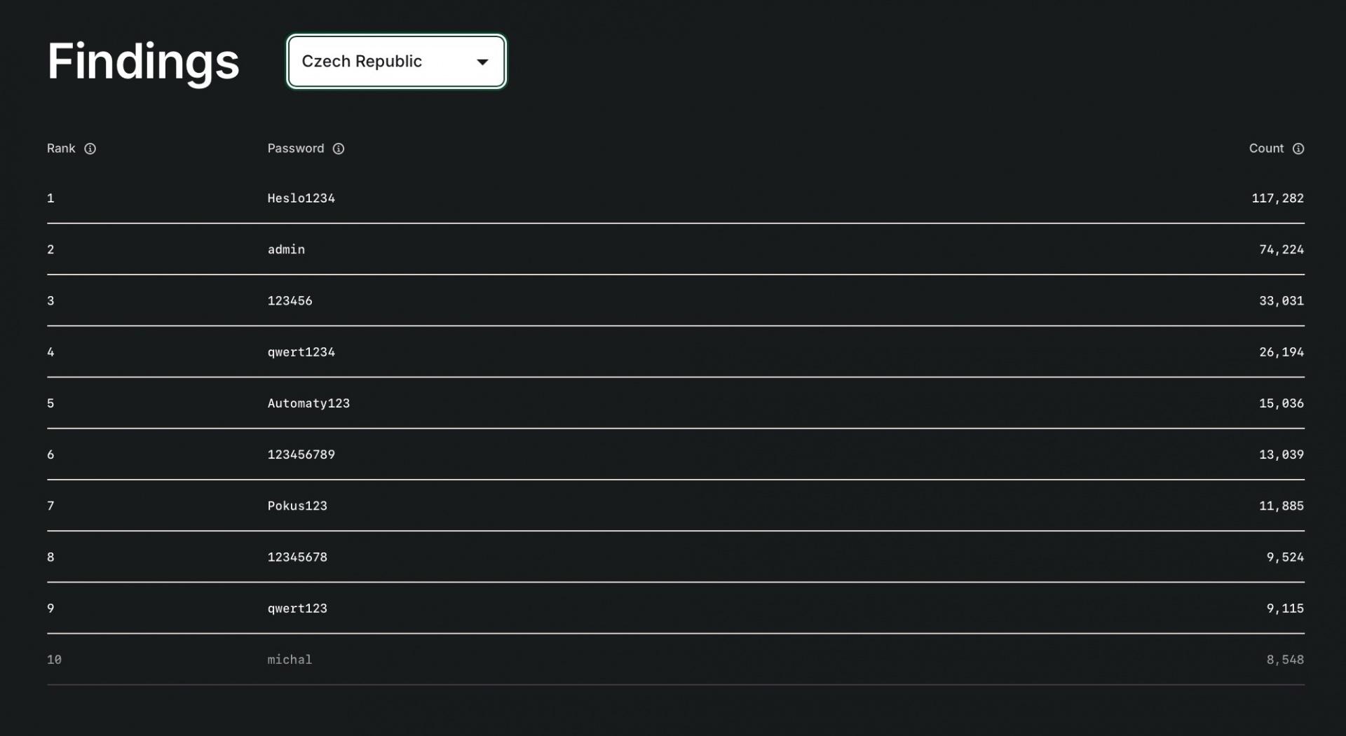 Ve srovnání s loňským rokem se Češi viditelně zlepšili, začali více používat kombinace čísel a písmen; mimo jiné kvůli tomu, že to vyžaduje stále více webů. Například vloni bylo naprostou stálicí heslo „123456“, které i méně sofistikované nástroje prolomí za méně než 1 sekundu. Letos jde o nejčastější heslo v České republice „Heslo1234“, které bylo odchyceno ve více jak 117 tisíc případech. Zlepšení je patrné, ale i tak jde o velmi slabé heslo.