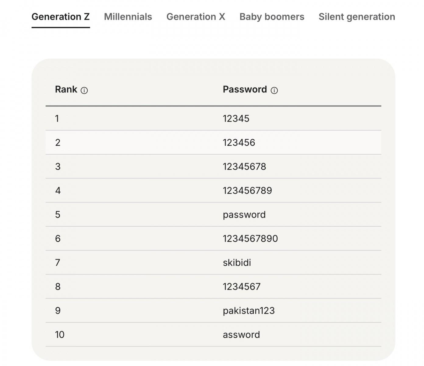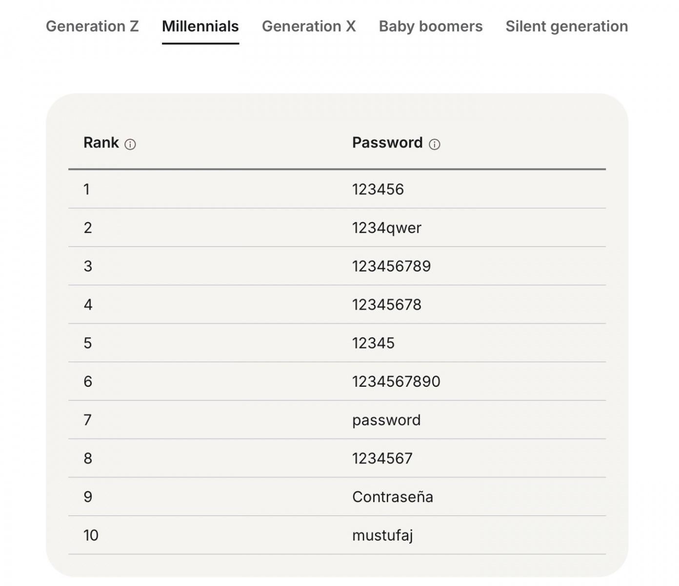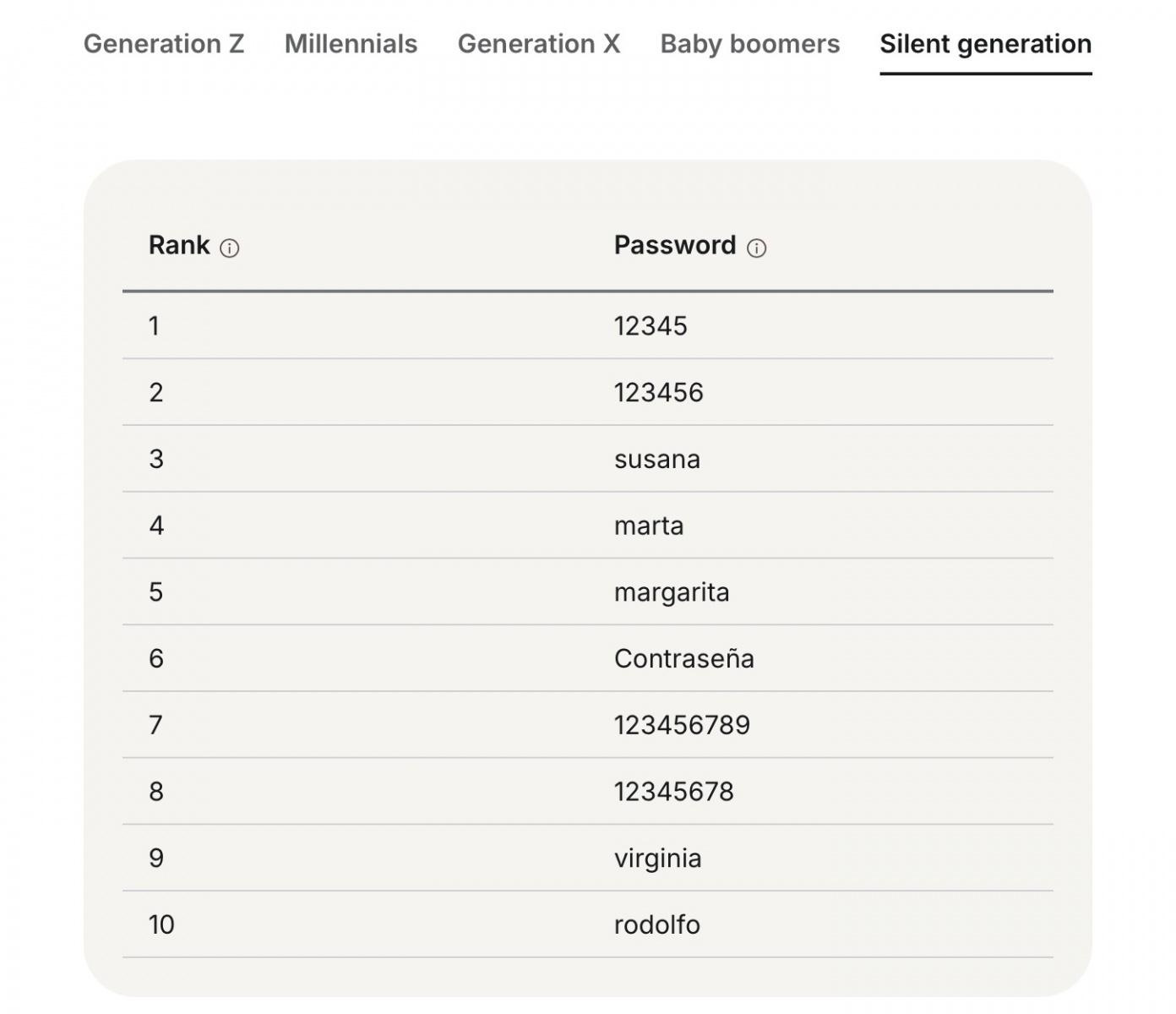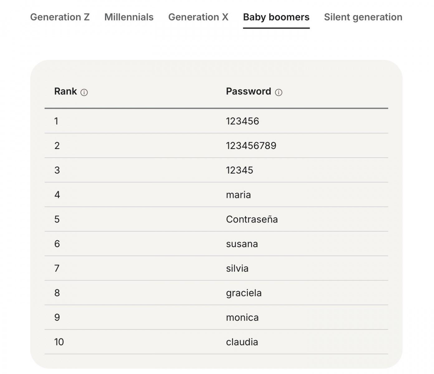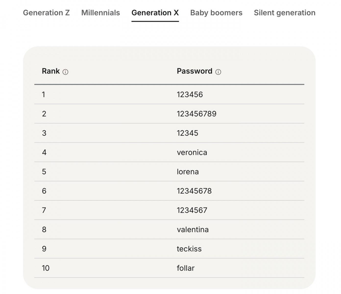 NordPass rovněž rozebírá, jak se liší hesla v závislosti na věku uživatelů. Zatímco mladší (generace Z a mileniálové) častěji využívají číselné řady, starší generace (X, baby boomers a ještě starší) více volí jednoduchá vlastní jména – veronica, lorena, maria, silvia – což lze pozorovat i u důchodců a starších uživatelů v Česku. Kdo někdy nastavoval nějaký webový účet se svým spřízněným seniorem, ví, o čem je řeč.