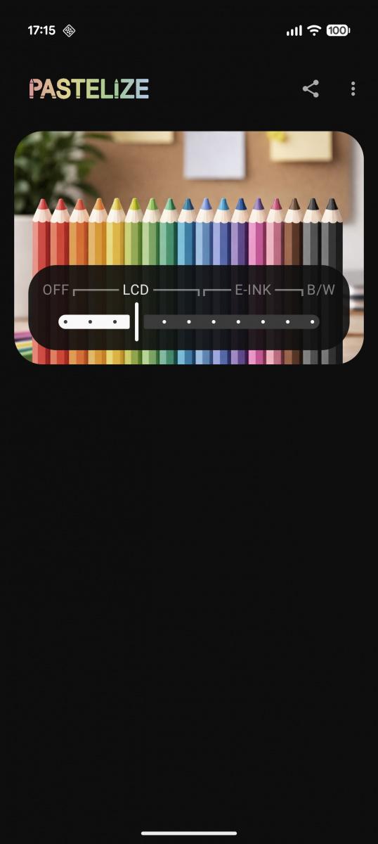 Aplikace Pastelize nabízí také zmíněný černobílý režim, ale její hlavní předností je plynulá regulace saturace barev v kombinaci s E-ink režimem. Barvy můžete měnit v pěti úrovních, jednoduchým pohybem posuvníku zleva doprava a E-ink režim pak nabízí čtyři úrovně nastavení. Regulace v pěti úrovních znamená snížení saturace na 50 %.