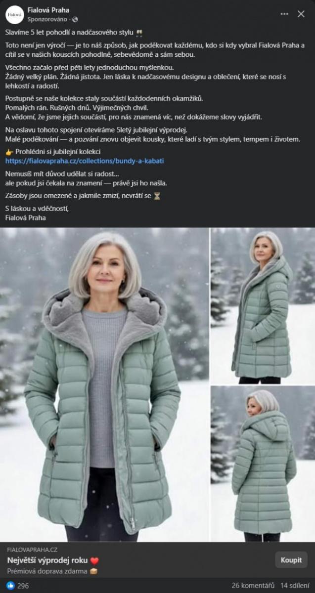 „Stránky jsou pojmenovány podle podobného vzorce. Norva Praha, Perla Praha, Sarah Praha, Jana Praha, Moravec Brno, Ateliér Olomouc, Fialová Praha, Velora Praha, Krása Móda, Butik Zlata Brno, Jemná Praha, Viktorie Plzeň, Praha Chic a tak bychom mohli pokračovat dále, podvodných stránek zapojených do této kampaně lze najít poměrně velké množství. Obsah je tvořen s pomocí AI služeb,“ upozorňuje Miloslav Lujka z Check Point Software Technologies.