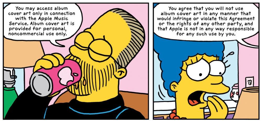 Jak kreativně zpracovat podmínky používání iTunes, to ovšem nedalo spát umělci Robertu Sikoryakovi, který na základně proslule nezáživného textu vytvořil téměř stostránkový komiks s příhodným názvem Terms and Conditions. Už samotná obálka si nepokrytě utahuje z ikonického ředitele Applu Steva Jobse, který je po okrajích vyobrazen v různých podobách, například jako Homer Simpson. Dominantní je ovšem podoba Jobse jakožto Wolverina z X-Menů včetně jeho vysunovacích drápů.