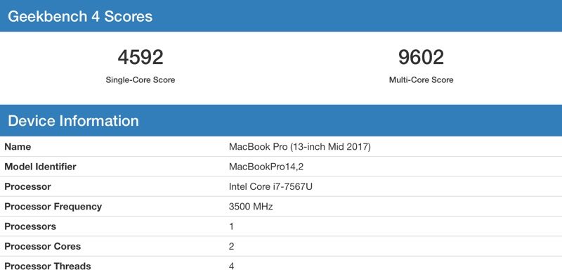 Rozum však zůstává stát nad porovnáním s novým 13″ MacBookem Pro. V jednojádrových aplikacích zde bylo naměřeno 4592 bodů, ve vícejádrových aplikacích pak 9602 bodů. I když zde tedy A11 lehce pokulhává ve výkonu na jedno jádro, můžeme vidět, že jej ve více jádrech jednoznačně poráží. Pro měření zde byl použit MacBook Pro s dvoujádrových procesorem Intel Core i7 o základním taktu 3,5 GHz, který je tak tou nejlepší konfigurací tohoto modelu. Konfigurace se slabšími procesory si tak vedly ještě o poznání hůře.