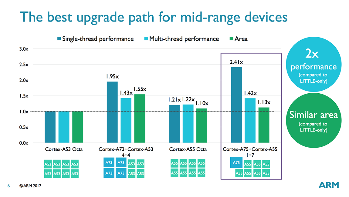 Společnost ARM, která poskytuje výrobcům čipsetů licence na vlastní procesorová jádra, představila v rámci veletrhu Computex novou generaci jader Cortex-A75 a A55 založených na nové technologii DynamIQ. Zatímco první jmenovaný návrh má být určen do prémiového segmentu těch nejvybavenějších zařízení, jádra Cortex-A55 mají zaujmout ve střední třídě zařízení.