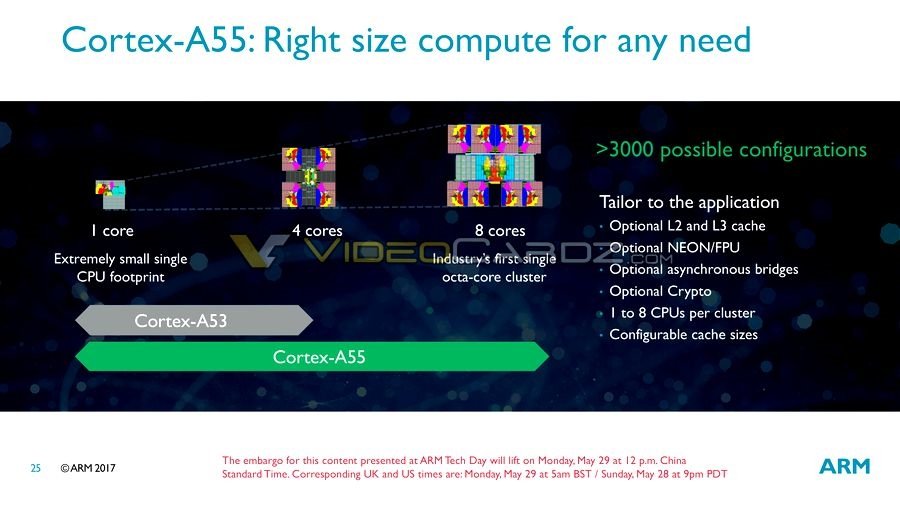 Nová jádra Cortex-A55 bude možné umisťovat do clusterů nejen po čtyřech, ale dokonce i po osmi, čili se budeme moci dočkat i čipsetů s 16 jádry ve dvou clusterech po osmi.