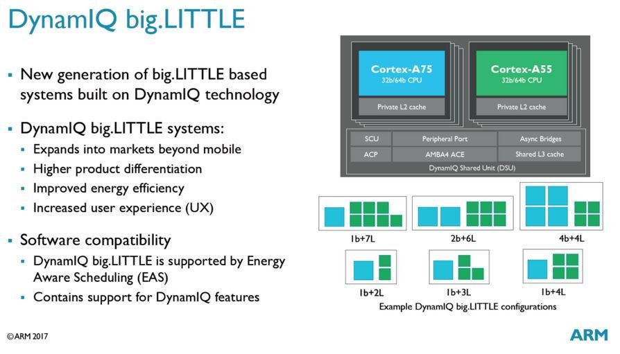 Nová technologie DynamIQ má nabídnout více flexibilní řešení pro návrh čipsetů z hlediska větší volnosti výběru jader; výrobci například budou moci postavit osmijádrový procesor s jedním jádrem Cortex-A75 a sedmi jádry Cortex-A55, dále jsou možné konfigurace 4+4, 2+6 nebo 1+3 a další jednuclusterové varianty.