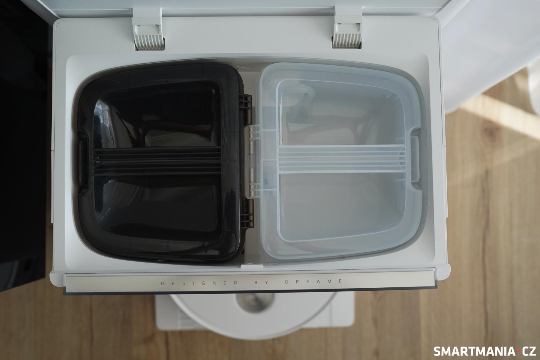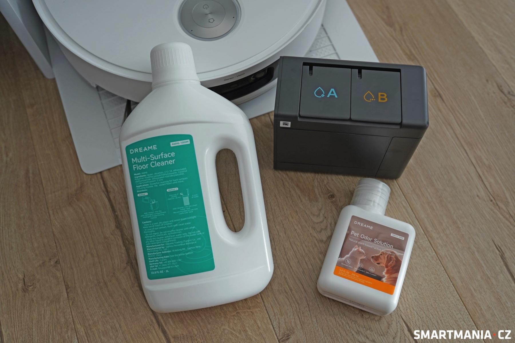 Jak jsem již zmiňoval výše, její součástí je i duální nádobka na čisticí přípravek na podlahu a prostředek pro pohlcování pachů domácích mazlíčků, které se během vytírání automaticky dávkují. Tyto přípravky jsou již součástí balení a není tedy nutné je hned dokupovat. Kromě ní samozřejmě nesmějí chybět dvě velké nádoby na čistou (4 litry) a špinavou vodu (3,5 litru).
