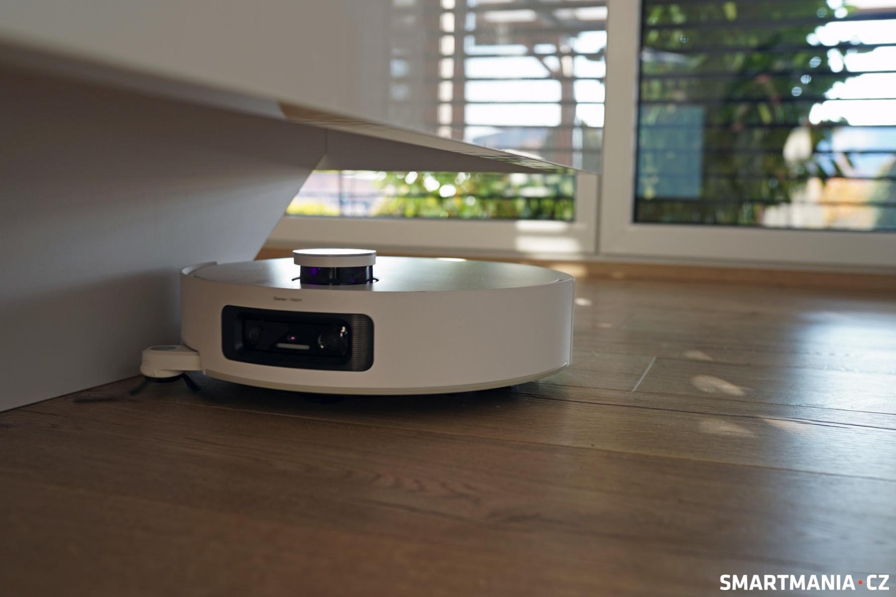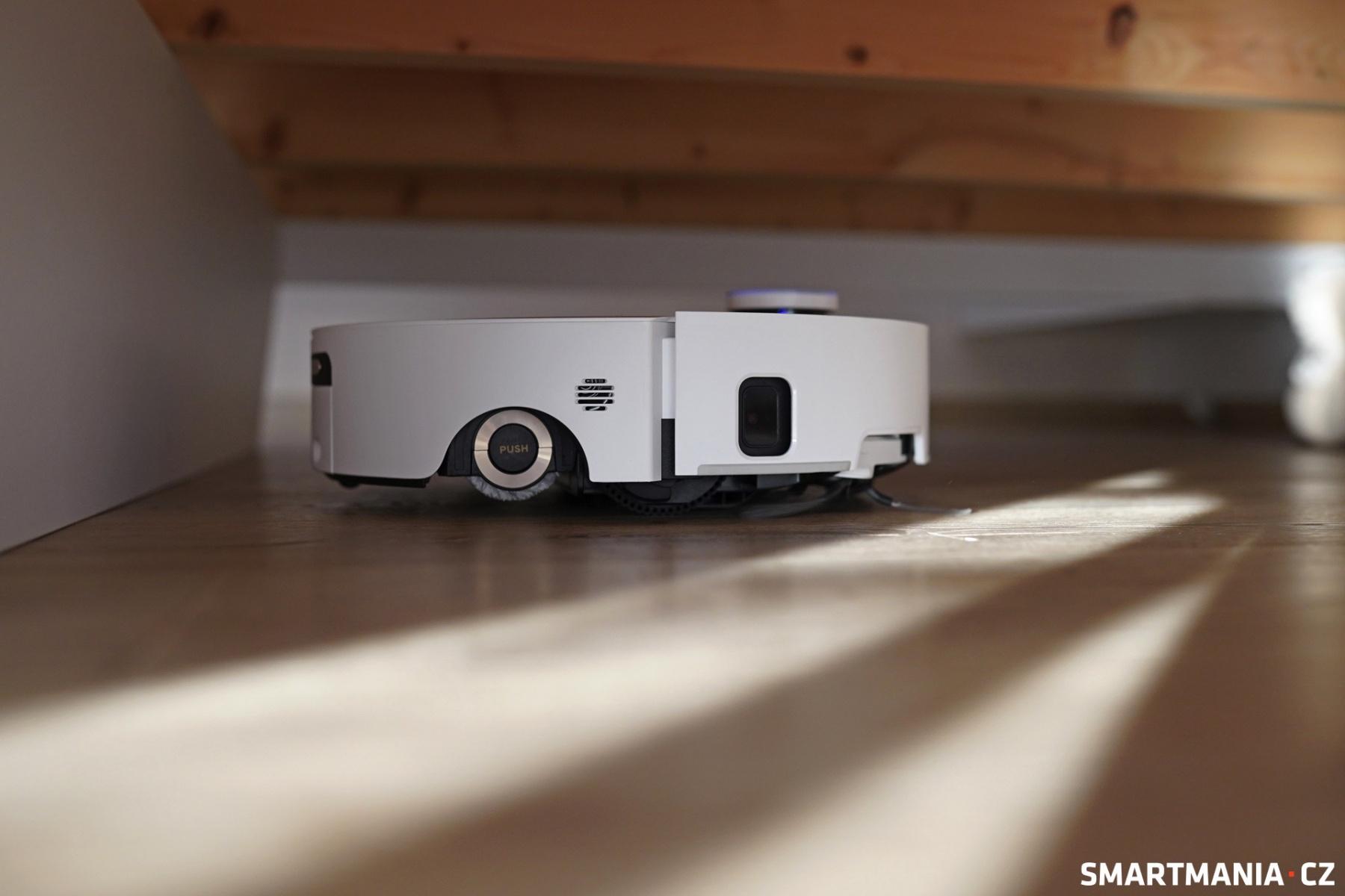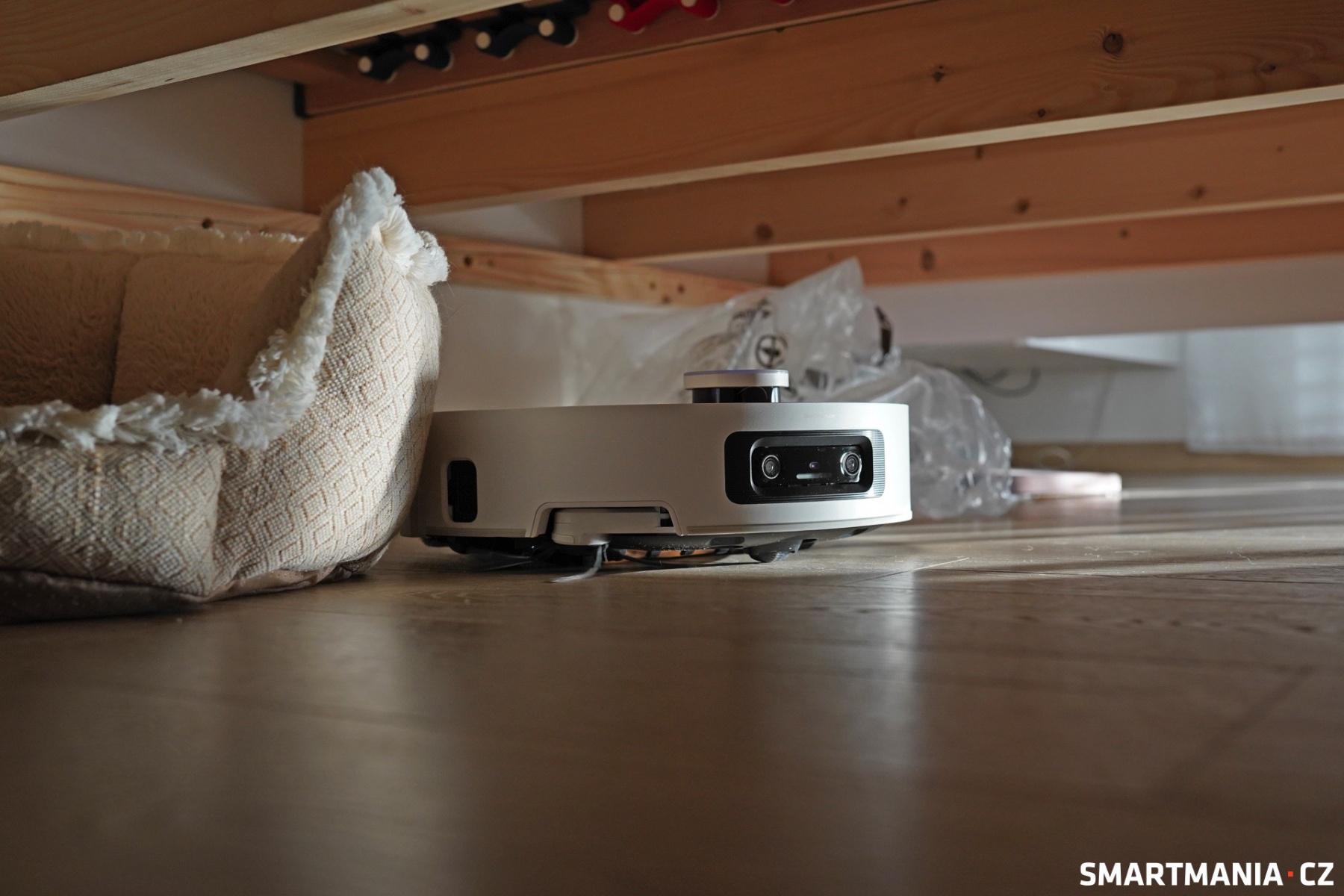 Nejenže Dreame Aqua 10 Ultra Roller umí překonávat překážky, ale výrobce myslel i na to, aby se dokázal dostat pod snížený nábytek. Na rozdíl od předchozích modelů, které jsem testoval, jako například Dreame X40 Ultra či Dreame X50 Ultra, se ale tato novinka ani po zasunutí majáčku nedokázala dostat pod naši sedací soupravu a ani skříňku v koupelně. Celková výška (po zasunutí lidaru) je stále 9,75 cm, což není úplně málo. S vysunutým lidarem je to téměř 11,5 cm.