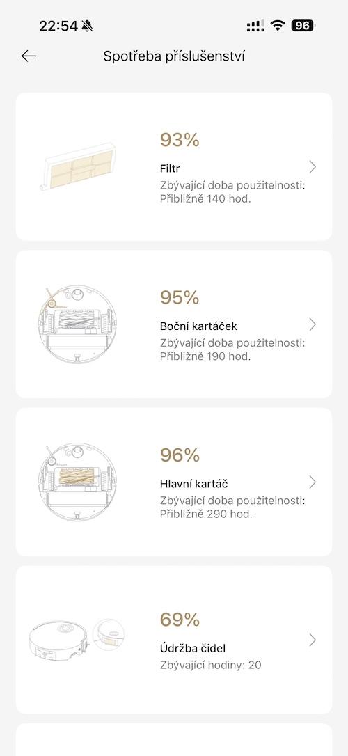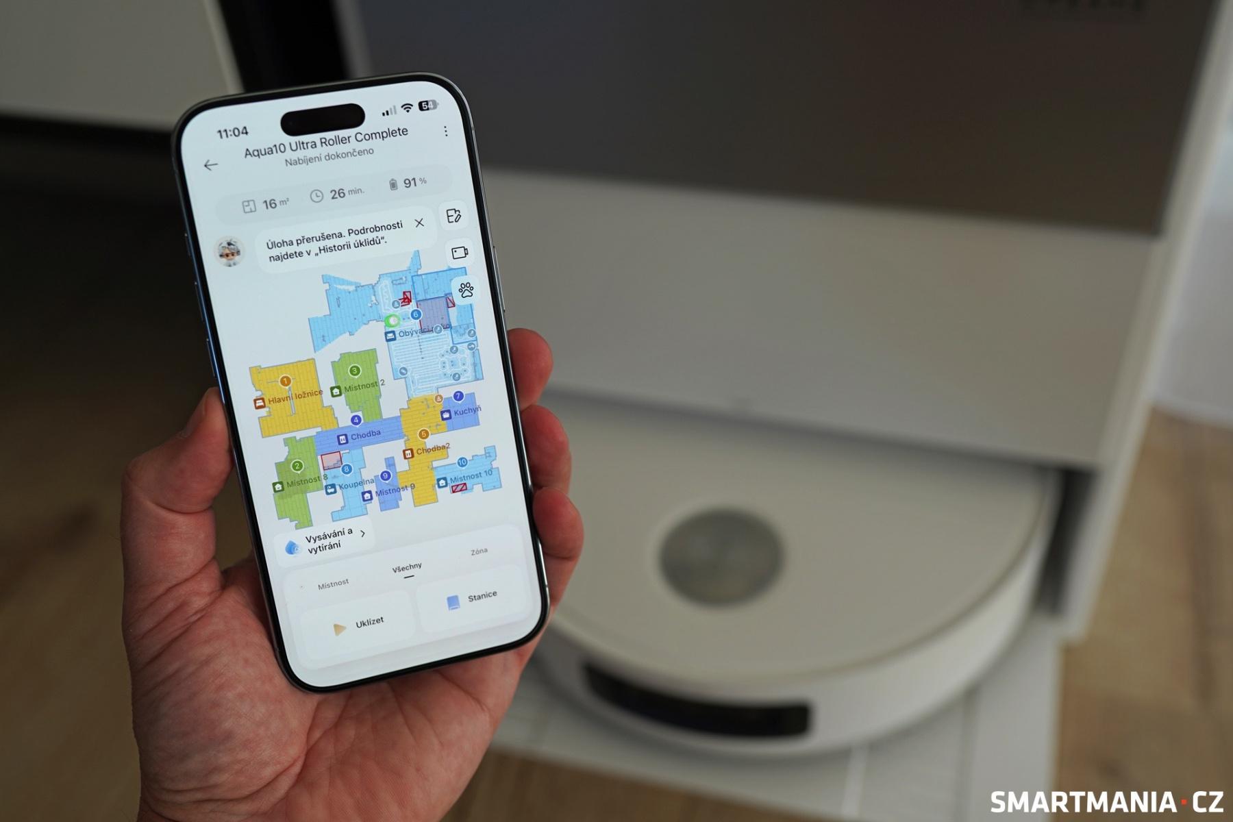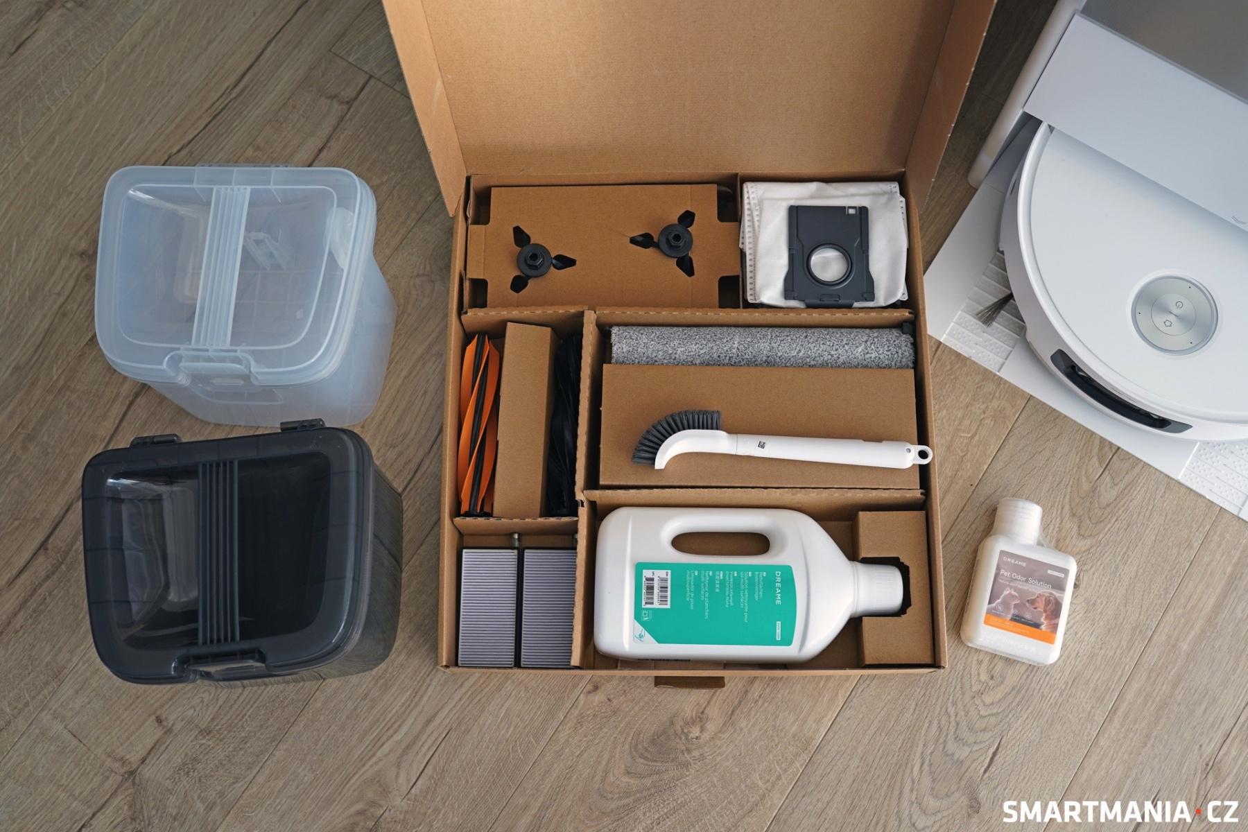 Aplikace vám čas od času nabídne možnost nechat spodní prostor dokovací stanice vyčistit automaticky pomocí horké vody, která se po několika minutách odsaje zpět do nádoby na špinavou vodu. Přibližně jednou za 4 až 5 týdnů ale provádím drobnou údržbu, která zahrnuje vyčištění dokovací stanice, vyprání mopovacího válce & vyčištění válečků a prostoru kolem nich. Sympatické je, že v balení najdete náhradní mopovací válec, dvě štětinky, dva gumové kartáče, čtyři sáčky na nečistoty a tři náhradní HEPA filtry.