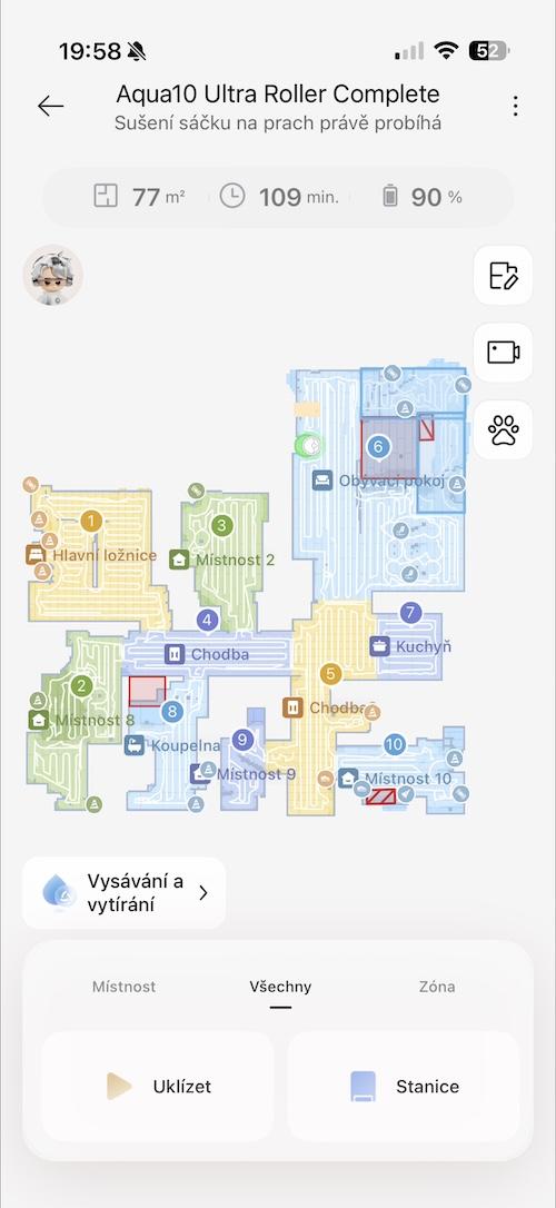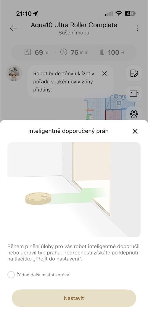 Na mapě si dále můžete vybrat místa, kde se má snížit maják s lidarem, případně kde má překonat práh. Nechybní ani možnost přidat zakázané zóny, virtuální zdi či plochy, kde nemá mopovat. Možnosti přizpůsobení mapy jsou opravdu rozsáhlé. Systém dokonce do mapy sám umí zanést detekovaný nábytek, případně si jej můžete přidat sami ručně.