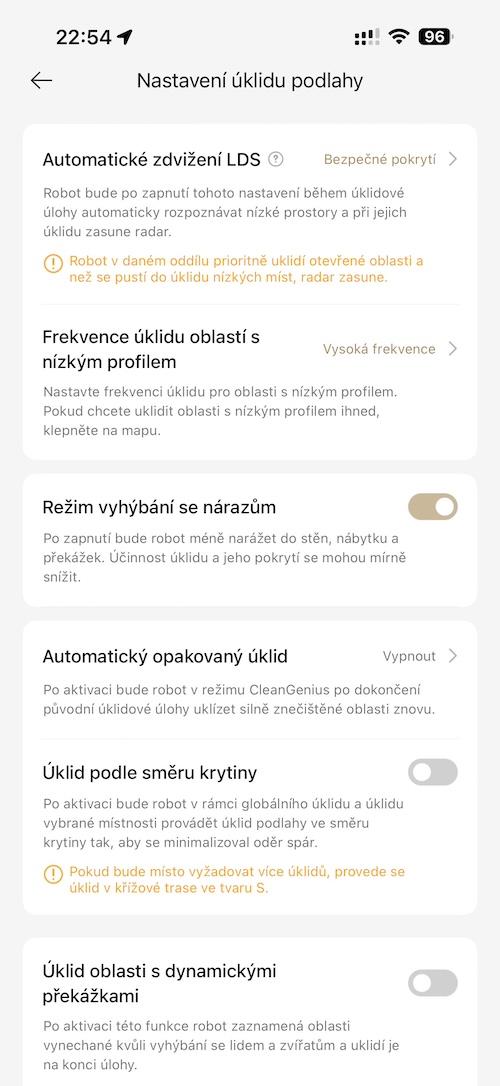 Mobilní aplikace nabízí velmi podrobné možnosti přizpůsobení, nicméně na méně zkušené uživatele těch položek může být až příliš. Přiznám se, že jsem napříč všemi testovanými produkty nenašel žádný jiný, který by takto detailní konfiguraci nabízel. Sympatické nicméně je, že pokud se v ní nechcete prohrabovat, nemusíte. I s výchozím nastavením je vše optimálně nastavené. Ale pokud máte nad věcmi rádi kontrolu, můžete si přizpůsobit prakticky libovolný aspekt chování robota. Možností v nastavení je tolik, že jsem občas tápal, kde se jaká položka nachází. Více o tom ale až v samostatné kapitole.