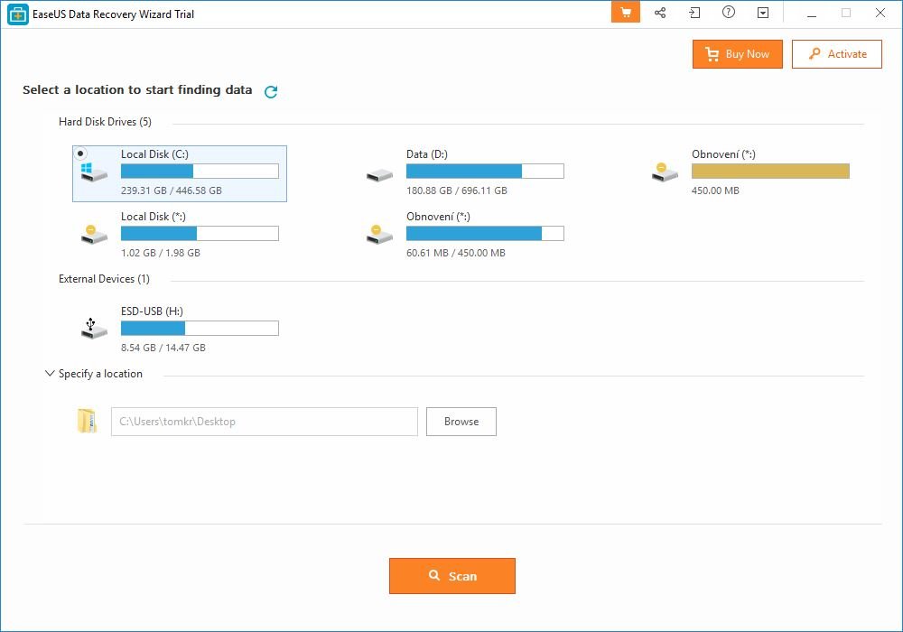 Pokud nechcete data vyhledávat v celém disku, máte možnost specifikovat lokaci. K tomu slouží klasické políčko pro zadání cesty a nechybí ani tlačítko procházet.