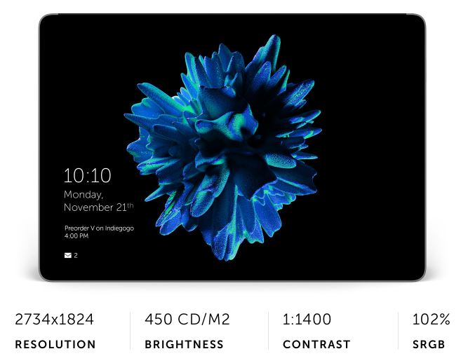 Konceptuálně se jedná o zařízení podobné počítačům Microsoft Surface Pro, tady tablet s výklopným stojánkem a připojitelnou klávesnicí. Tablet disponuje 12,3″ IGZO LCD displejem s neobvyklým rozlišením 2 736 × 1 824 pixelů, kontrastem 1:1400 a maximálním jasem 450 nitů. Multimediální zážitek navíc podporuje čtveřice reproduktorů (každý 1 W) s profesionálním zesilovačem TI.