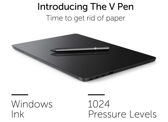 V balení se kromě tabletu nachází i připojitelná bezdrátová klávesnice a také stylus V Pen, schopný rozeznat 1024 úrovní tlaku.