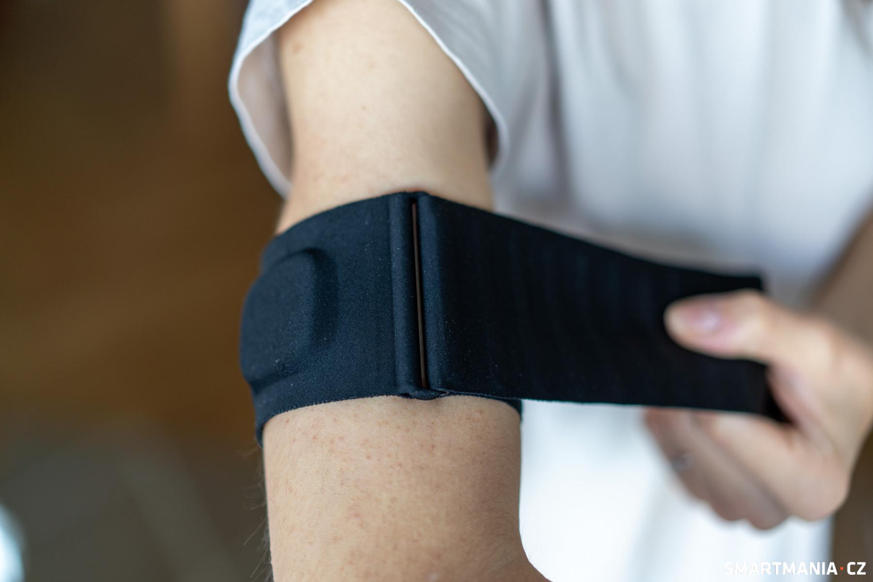 Design produktu je velmi jednoduchý, v podstatě se jedná pouze o pásek, uvnitř kterého je vsazen modul se senzory. Vše je vyrobeno s důrazem na nízkou hmotnost a co nejmenší zátěž na ruce při spánku. Pásek nebo chcete-li řemínek má tloušťku 63,5 mm, aby se tlak na paži co nejvíce rozložil. K dispozici je ve dvou velikostech pro různé šířky paží. Osobně jsem testoval variantu L-XL, ale pro subtilnější ženské postavy bych určitě doporučil menší variantu S-M.