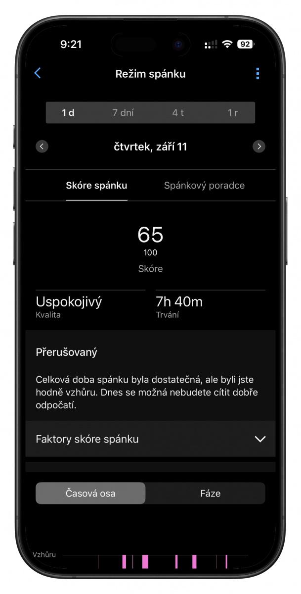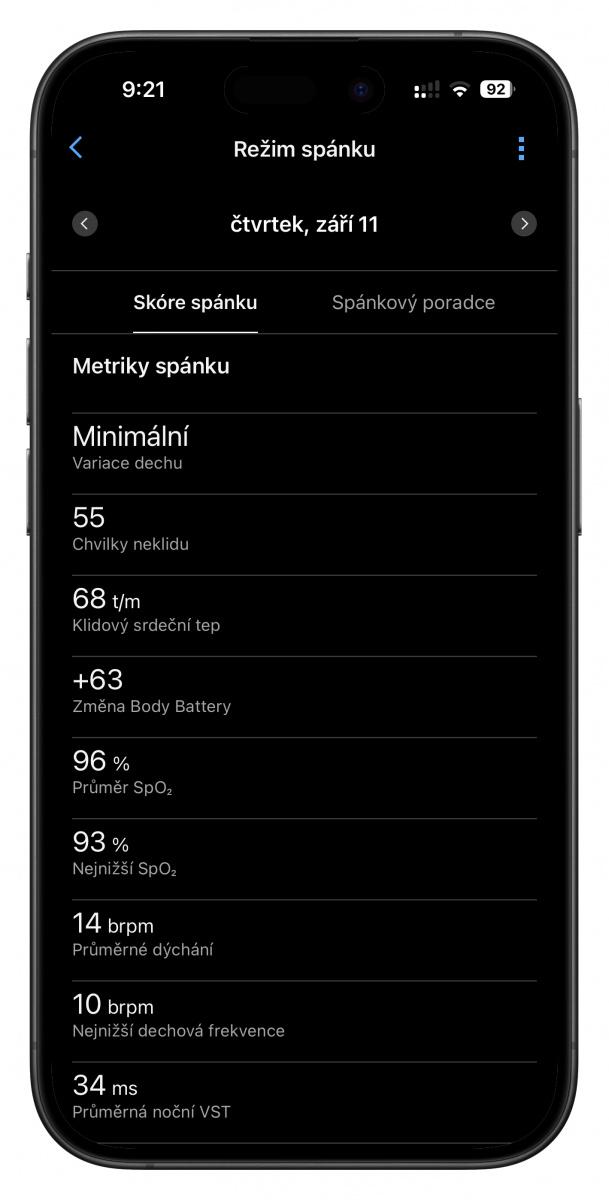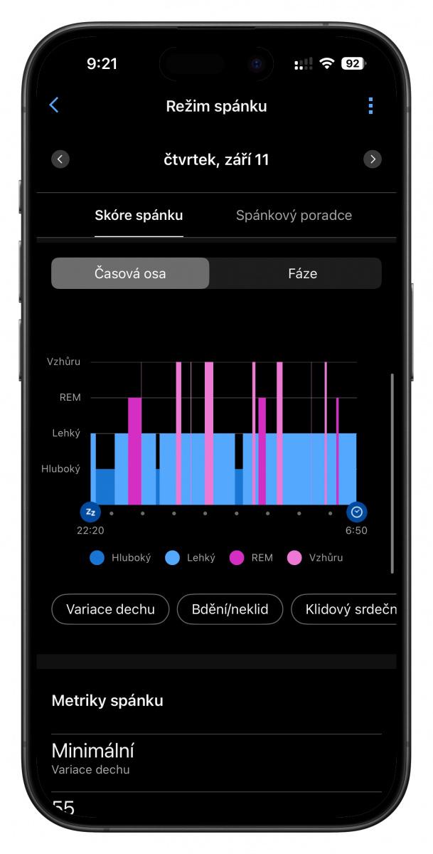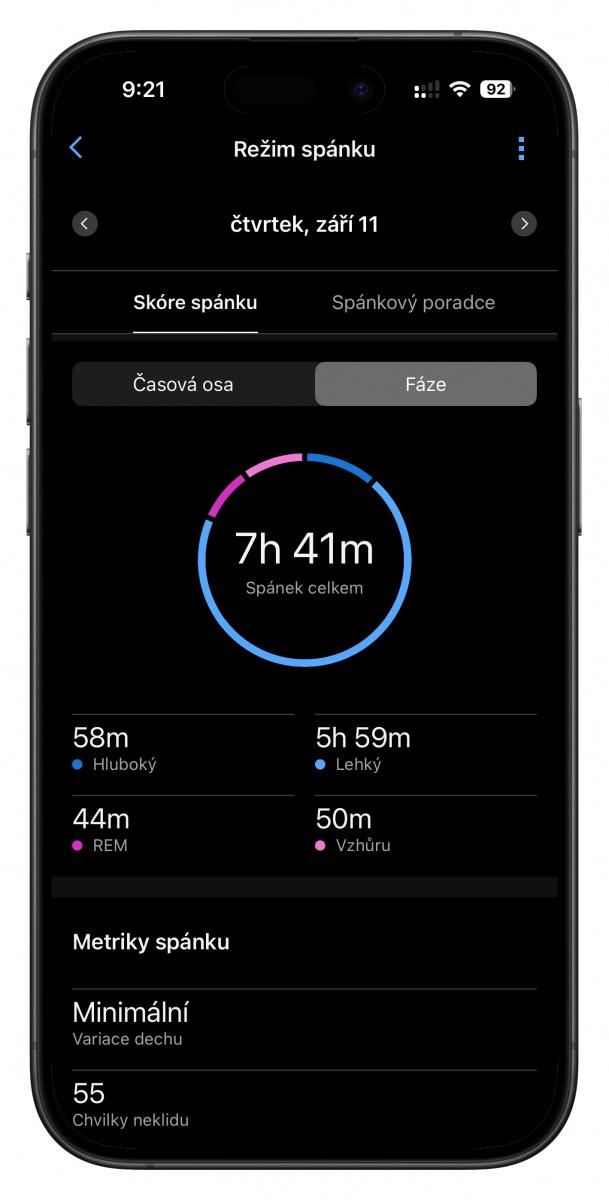 Jednotlivé fáze spánku se zobrazují graficky v koláči i číselně jako data, dělí se na hluboký, lehký, REM a vzhůru. Tyto fáze je samozřejmě možné zkontrolovat i na časové ose, do které lze promítnout také srdeční tep nebo třeba variaci dechu. Všechny tyto parametry jsou ale k dispozici i v číselném vyjádření: chvilky neklidu, klidový srdeční tep, změna body battery, průměrné okysličení krve, nejnižší okysličení krve, průměrná frekvence dechu, nejnižší frekvence dechu a další.