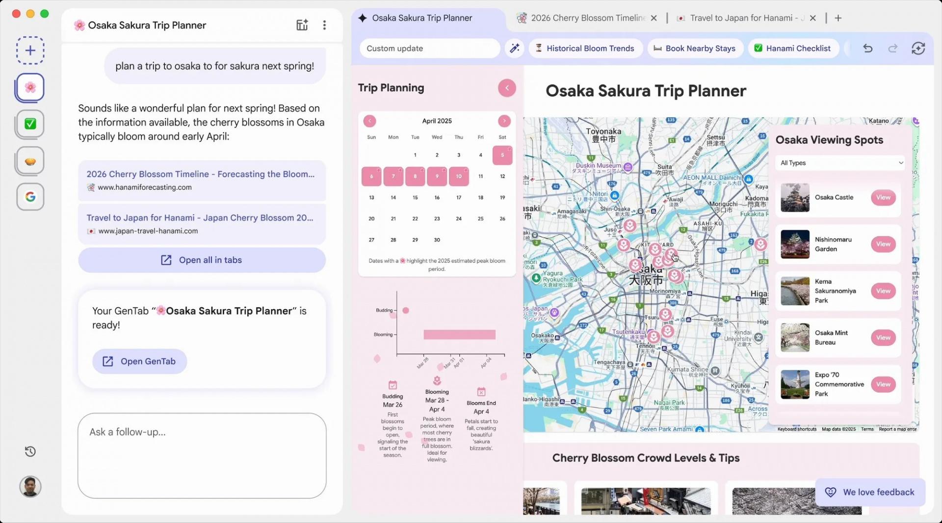 Klíčovým stavebním prvkem jsou „projekty“: prostředí, které spojuje chat, běžné otevřené stránky a generovanou kartu (GenTab). Uživatel tedy nepracuje jen s izolovaným chatem, ale s kontejnerem, v němž jsou vidět zdroje z otevřeného webu, a zároveň vzniká výstup ve formě interaktivní stránky. V ukázce z prostředí Disco tým například zadal plánování cesty do Japonska. Prohlížeč otevřel sadu relevantních webů a nabídl vytvoření plánovače, který následně zobrazil mapu, body zájmu, jednoduchý návrh itineráře a odkazy na zdroje, z nichž čerpal. Jakmile uživatel v projektu otevřel další stránky, GenTab se průběžně aktualizoval a zapracoval nová data.