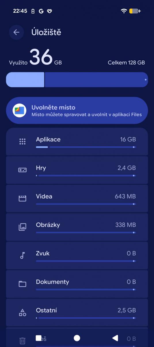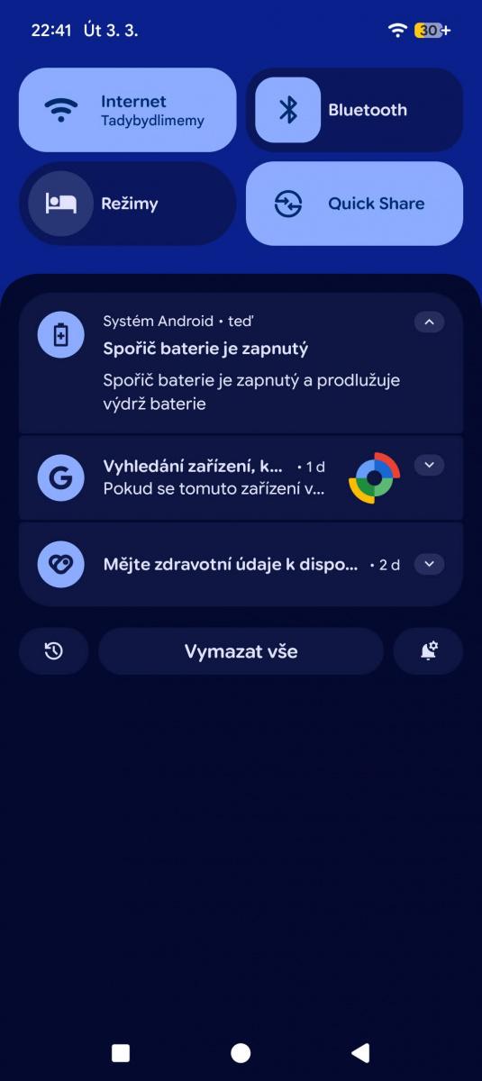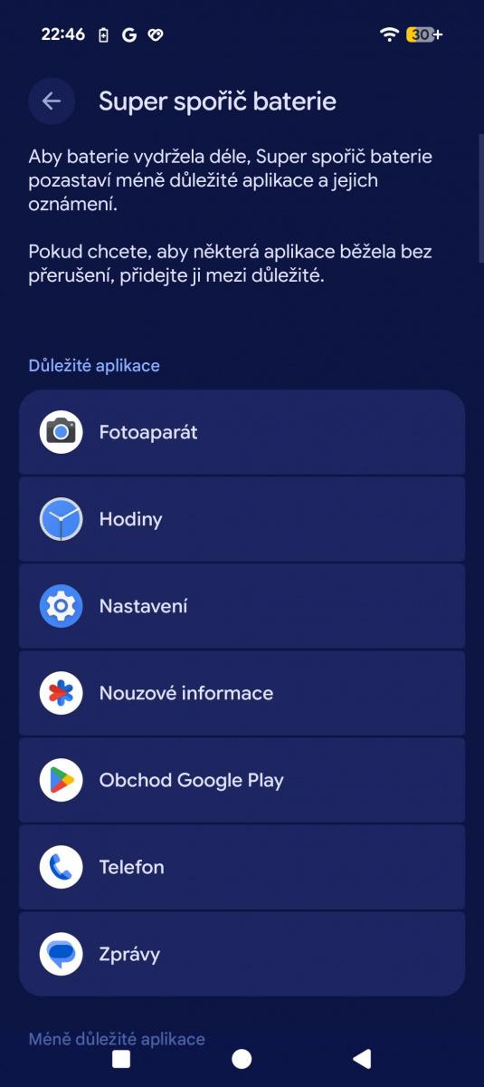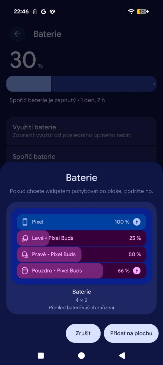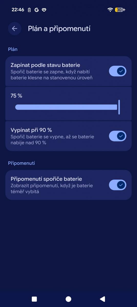 A něco na tom bude! Dokážu si představit, že Pixel vydrží noc bez nabíječky, aniž byste aktivovali jednu ze dvou úrovní šetřiče baterky. Ty lze aktivovat automaticky v závislosti na zbývající energii od 20 do 75 %, ale chybí jim jemnější doladění. Standardní spořič jen zapne tmavý motiv, zredukuje běžící procesy a omezí efekty. Integrovat po vzoru Samsungu šetřič pod režimy a umožnit např. vypnout 5G, polohu atd. mi dává větší smysl.