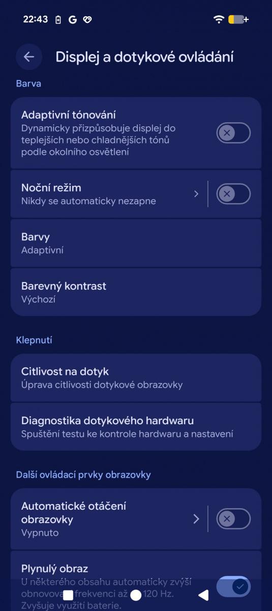 Nastavení jasu, AOD, tmavého motivu apod. je triviální. Pak ale narazíte na to, že můžete využívat adaptivní tónování displeje a vedle je možnost adaptivních barev. V nastavení kontrastu zase je možnost volit mezi třemi úrovněmi kontrastu s možností písmo podbarvit pro maximální rozdíl mezi černou a bílou. A aby toho nebylo málo, k adaptivnímu jasu lze přidat ještě „vylepšený jas HDR“.