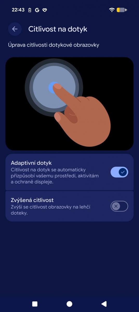 Stejný přístup se odráží i v menu Citlivost na dotyk. Zejména v zimních měsících je vítanou funkcí, ale opět jsem lehce zmaten, jak se liší adaptivní dotyk a zvýšená citlivost. V kontextu celého telefonu to ještě podtrhuje dojem, že Google jen vyrábí kouřovou clonu a snaží se mě zahltit nevýznamnými informacemi, abych se nevěnoval tomu podstatnému.