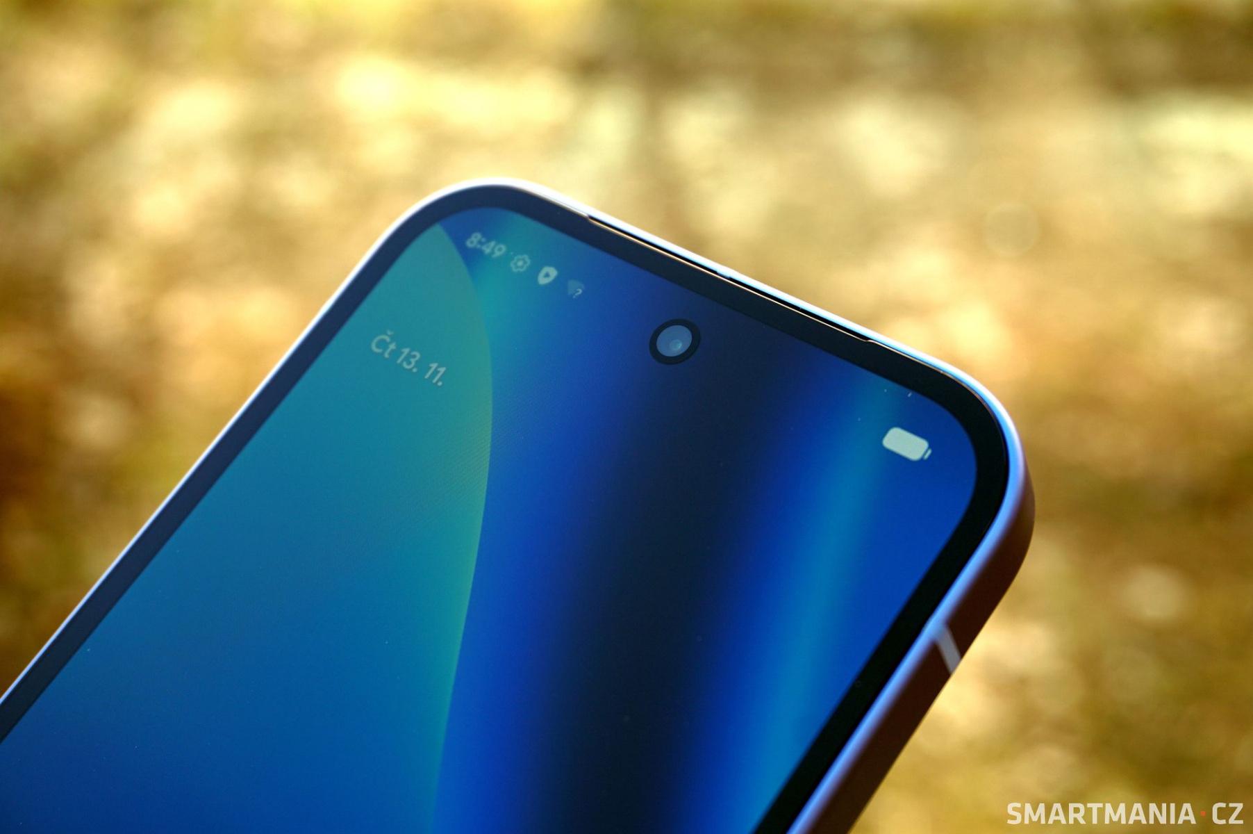 Ani rámečky okolo obrazovky se nezměnily. Jsou tlusté tak, že to v roce 2026 nepovažuji za slušné. Z čelní strany vidíte hranu rámečku, která si zlomek plochy zabere, ale další procenta ukousne černé lemování o šíři cca 3 milimetry. Dojem levného zařízení podtrhuje i selfie kamera. Samotná nepatří k nejmenším, ale při odemykání obličejem na sebe ještě upozorní – nejen, že se okolo ní objeví bílý kroužek, ale ten samotný na kameru přímo nedoléhá, protože je odsazený ještě o černé mezikruží. Opticky tak průstřel vypadá ještě větší, než ve skutečnosti je.