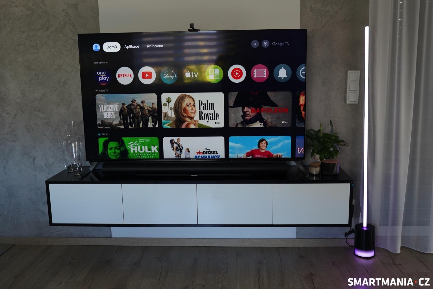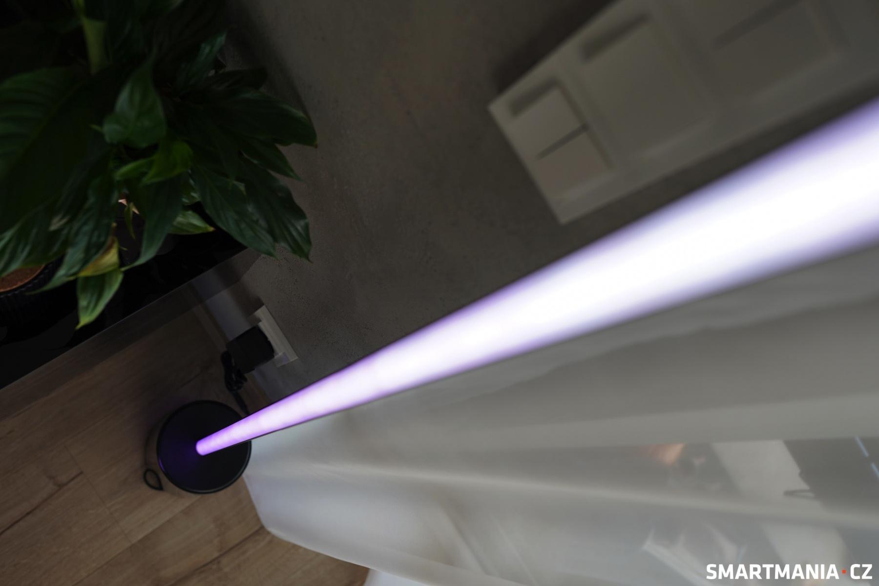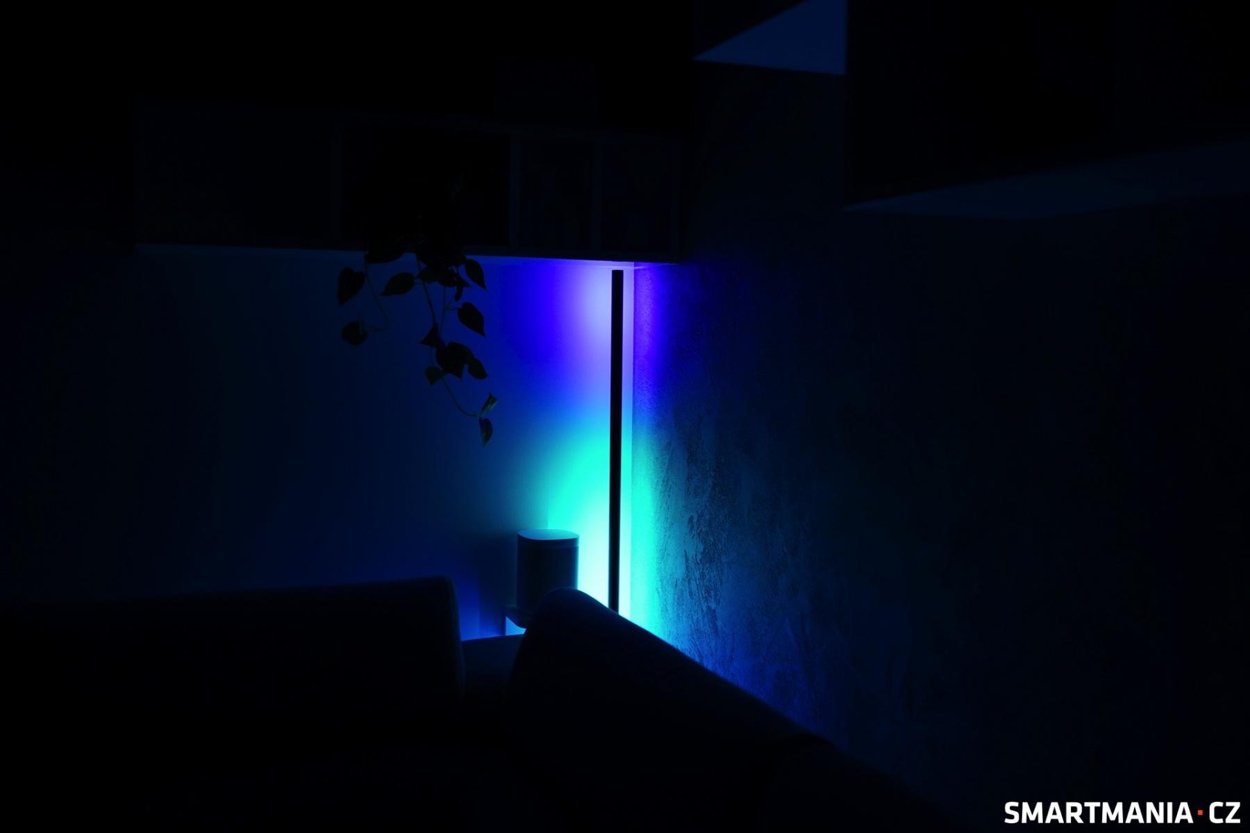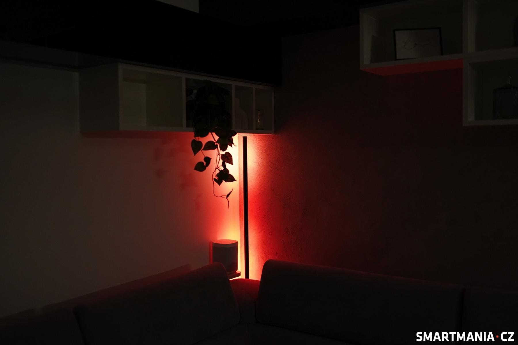 Lampu s výškou 1,52 metru (průměr základny je 14 centimetrů) lze umístit prakticky kamkoli, přičemž nejlépe vynikne v rohu místnosti, kde osvětlí okolní prostor a vytváří působivé barevné přechody na zdech. Kouzlem nechtěného se mi v obýváku na centimetr přesně vešla pod nástěnnou poličku za gauč. Chvíli jsem lampu sice používal i vedle televize, jak je vidět z fotografií, ale nakonec jsem se pro lepší dokreslení atmosféry v místnosti rozhodl ji umístit do rohu za sedací soupravu.
