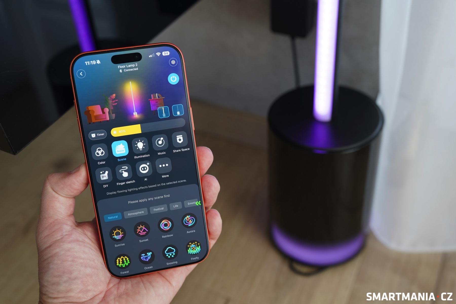 Ten správný dojem ale udělá ve chvíli, kdy ji zapnete – svítivost 1725 lumenů je na takovou lampu překvapivě vysoká hodnota, přičemž díky technologii RGBICWW s diodami 4 v 1 nabízí lampa více než 16 milionů barev a bílé světlo, které lze nastavit v rozmezí od 2200 do 6500 Kelvinů. Já sám jsem lampu testoval ještě v kombinaci s podsvícením televize Govee Backlight 3S a drtivou většinu času jsem měl úroveň jasu nastavenou na výrazně nižší hodnotu, zpravidla na 25 % (jak pro LED pásek za TV, tak pro samotnou lampu).