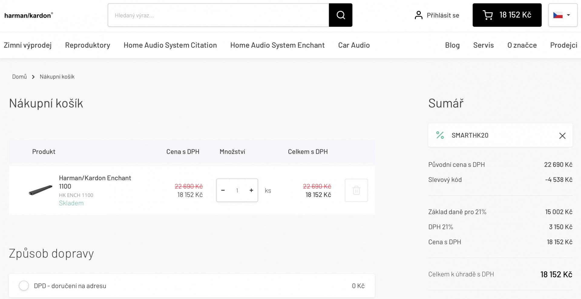 Všechny produkty Harman/Kardon Enchant Series, včetně soundbarů Enchant 900, 1100, Enchant Subwoofer a Enchant Speaker nyní pořídíte s exkluzivní slevou až 20 % na harmanshop.cz. Slevový kód SMARTHK20 je omezen pouze na 10 nejrychlejších nákupů.