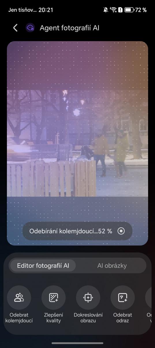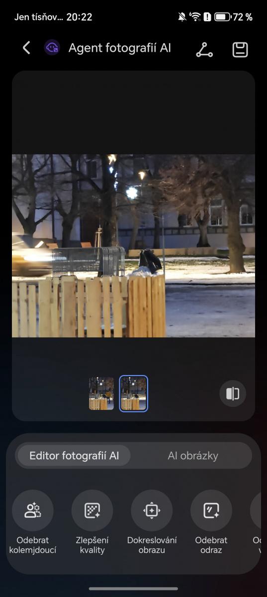Ve zhoršených světelných podmínkách se automaticky aktivuje noční režim s delší expozicí. Výsledky jsou velmi dobré, hlavní fotoaparát zachovává dostatek detailů. Ve tmě už se dostává ke slovu software a umělá inteligence, která vytáhne z obrázků barvy a detaily. Výsledky vypadají dobře, i když občas je zesvětlování příliš agresivní a samozřejmě to není příliš realistické.