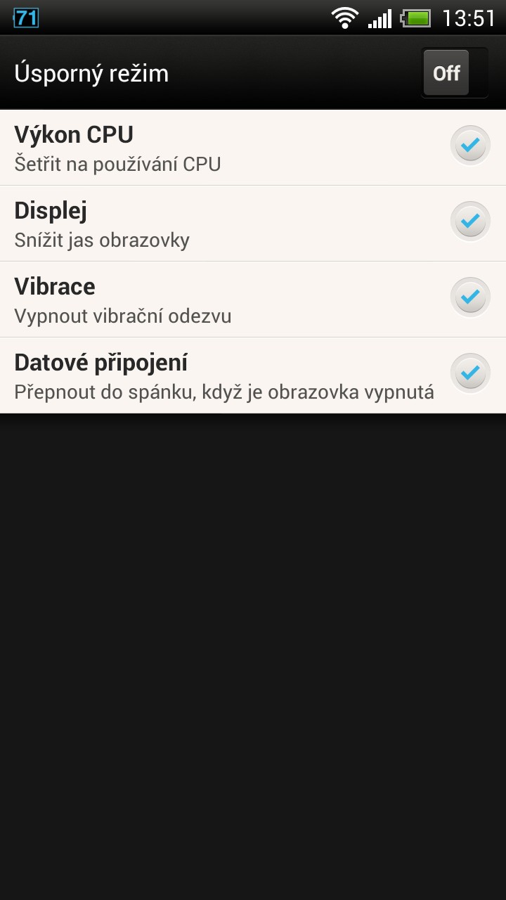 S hodnocením výdrže úzce souvisí asi největší nedostatek aktualizace na Jelly Bean. HTC totiž kompletně přepracovalo položku Napájení v nastavení systému a úplně z ní vypustilo údaj o spotřebě a délce používání displeje. A protože displej je největším žroutem energie, jsou tyto údaje klíčové pro objektivní zhodnocení výdrže.