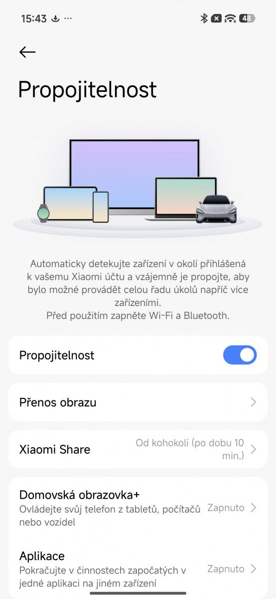 A když už jsme u Applu, nechybí velmi oblíbené propojení s Macem či iPadem. Stačí si na Apple zařízení stáhnout aplikaci Xiaomi Inteconnectivity, spárovat zařízení s mobilním telefonem Xiaomi a pak můžete velice pohodlně a rychle přenášet soubory z telefonu do počítače/tabletu, případně i sdílet obrazovku. Malá perlička, toto zrcadlení obrazovky Apple umí pro své telefony taky, ale v Evropské unii dostupné není. Xiaomi je tedy v tomto paradoxně dál; byť kvůli eurounijní regulaci.
