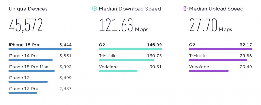 Z měření vyplynulo, že O2 má nejvyšší medián rychlosti stahování na 5G síti: 146,99 Mb/s a upload 32,17 Mb/s. Druhý T-Mobile naměřil nejvíce 130,75 Mb/s a 29,88 Mb/s, Vodafone pak 90,61 Mb/s a 20,40 Mb/s. Největší rozdíl v měření byl zaznamenán v Praze, kde O2 bodovalo rychlostí stahování 330 Mb/s, zatímco konkurence měla 161 Mb/s, respektive 88 Mb/s.