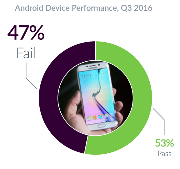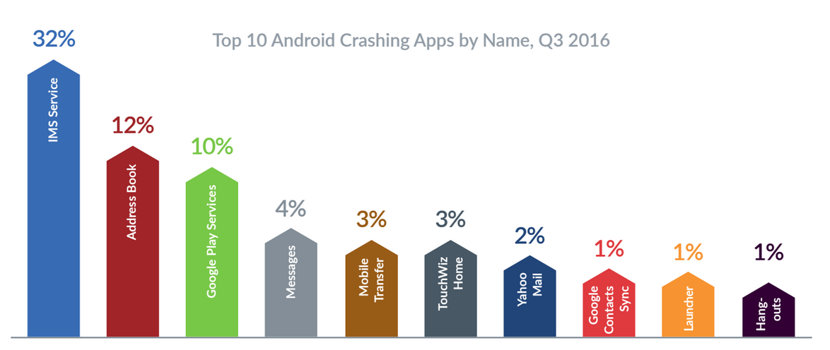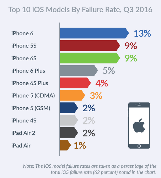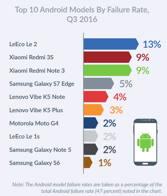 U společnosti Apple je největším viníkem iPhone 6, který ve 13 % zaznamenal nějakou nestabilitu systému – v závěsu jsou iPhone 6 & iPhone 5s s 9 % a poslední místo obsadil iPad Air s 1 procentem. U zařízení s Androidem nejvíce chybuje telefon LeEco Le 2 (13 %), v jehož těsném závěsu jsou zařízení Xiaomi Redmi 3S a Xiaomi Redmi Note 3 (9 %). Ani velice oblíbený Galaxy S7 edge není bez chyby, 5 % ze všech telefonů mělo nějaký softwarový problém.