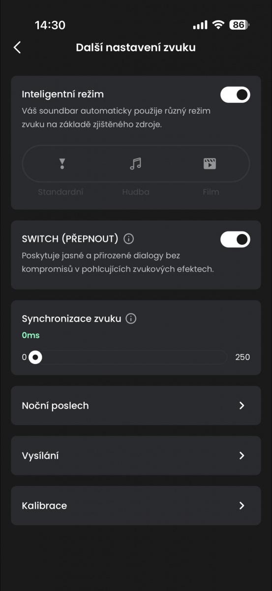 V aplikaci najdete jednoduchý ekvalizér, volbu režimů (film, hudba, noční režim, zvýraznění dialogů), přístup ke streamovacím službám (bez Spotify a Apple Music) i nastavení úrovně subwooferů a zadních kanálů. Zejména noční režim je skvělá funkce. Pokud chcete sledovat film a nechcete, aby celý systém duněl po domě/bytě a rušil například spící děti, jednoduše si v aplikaci aktivujete tento mód. Systém se obratem výrazně ztiší a především ubere na basové složce. Vy tak můžete dál pohodlně sledovat film, aniž byste kohokoliv dalšího budili.