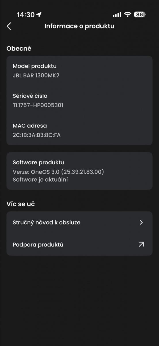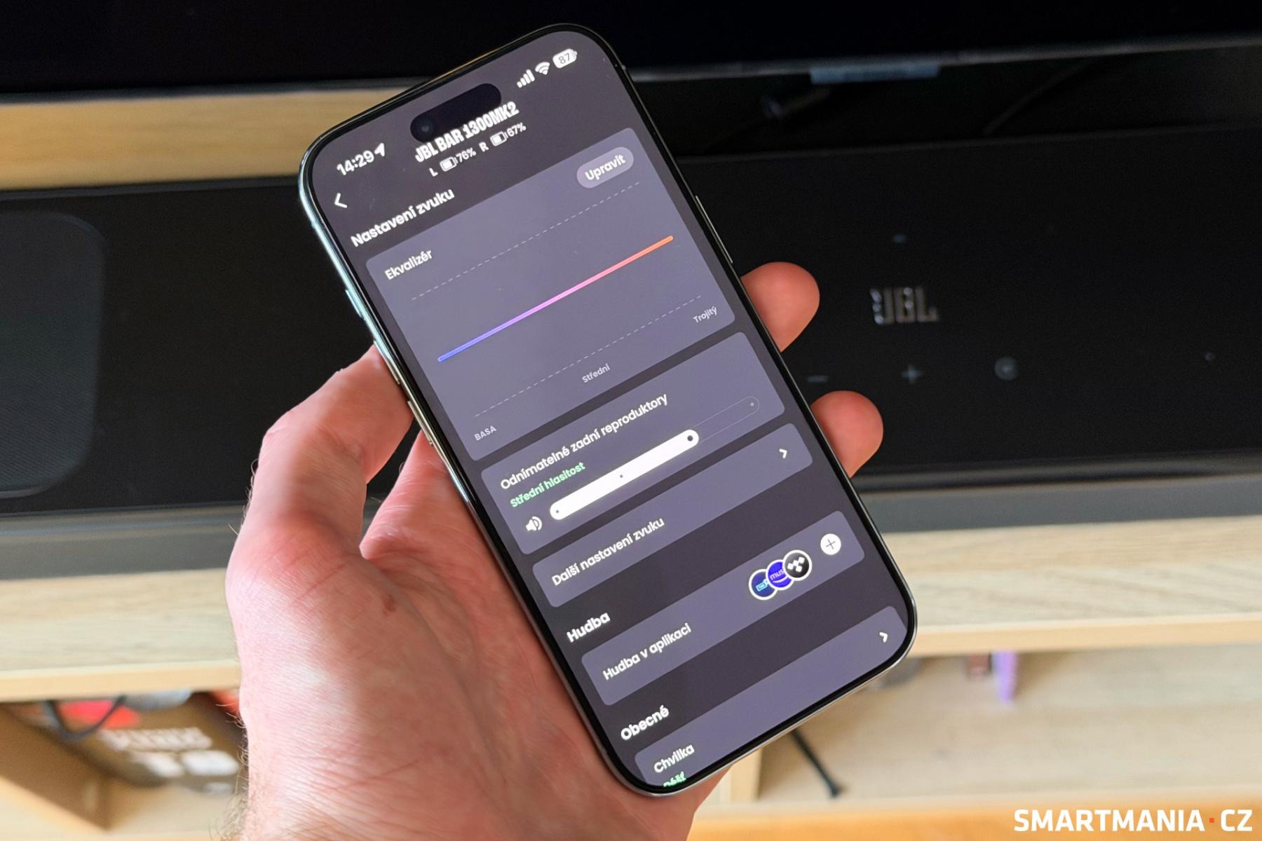 Ovládací centrum představuje aplikace JBL One, která slouží jak pro první zprovoznění sestavy, tak pro pozdější dolaďování. V rámci průvodce nastavíte připojení k Wi‑Fi, provedete automatickou kalibraci místnosti a spárujete jednotlivé moduly, přičemž rozhraní je přehledné i pro méně zkušené uživatele a většinu úkonů zvládnete během několika minut.