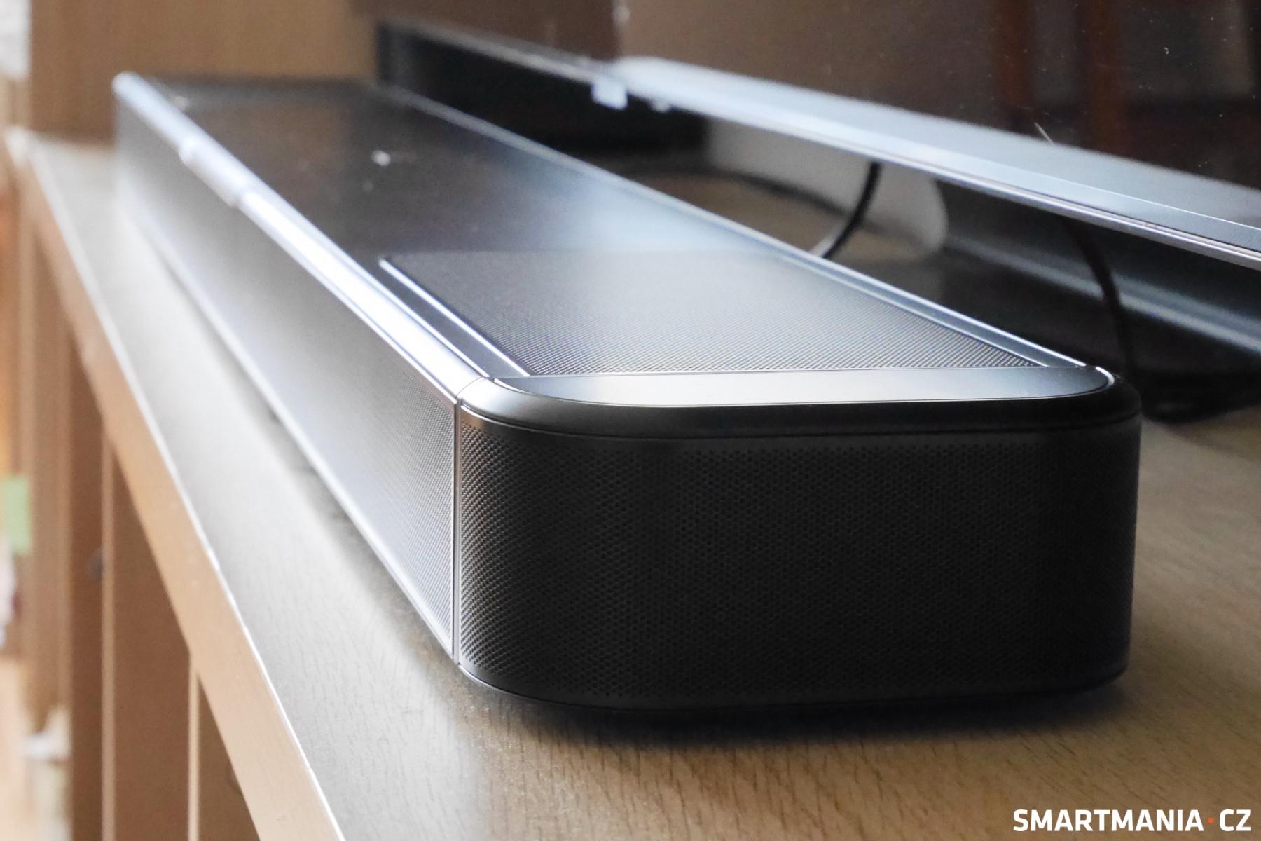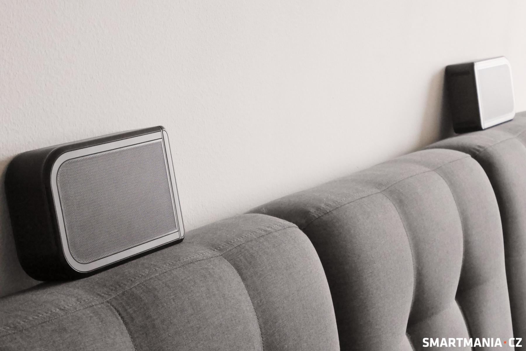 Co už ale nepřehlédnete, jsou odnímatelné reproduktory pro prostorový zvuk. Ty můžete používat buď jako součást soundbaru, ze kterého se po připojení rovnou nabíjejí, nebo je můžete umístit za sebe a vylepšit tak celkový prostorový zvuk. Nejvhodnější je umístit je do výšky hlavy, tedy na stolek či poličku za gaučem, případně na opěrky, jako v mém případě. Největším „narušitelem“ vašeho obýváku pak bude obrovský basový subwoofer, který váží 12 kilogramů a měří 31,5 × 27,2 × 27,5 centimetru. Malý není, ale rozhodně stojí za to si pro něj vyhradit místo, protože basy, které produkuje, jsou jedním slovem bombastické.