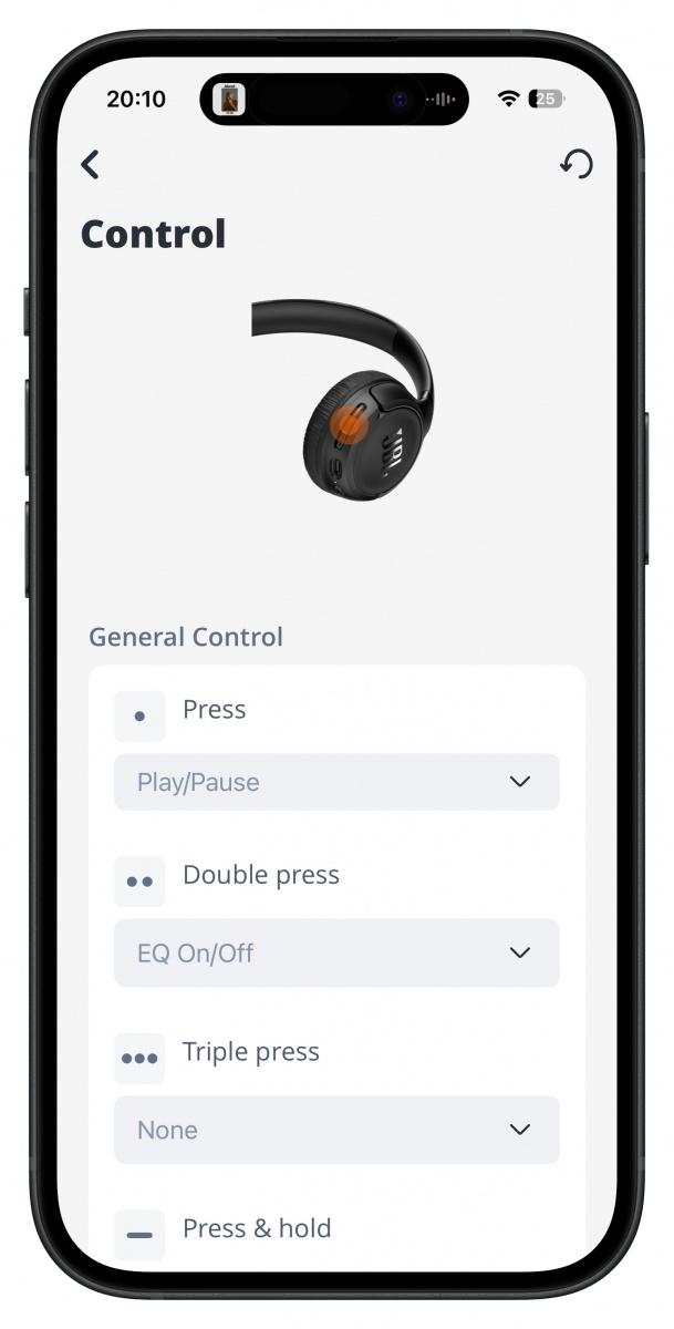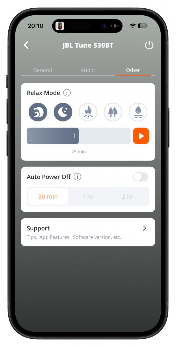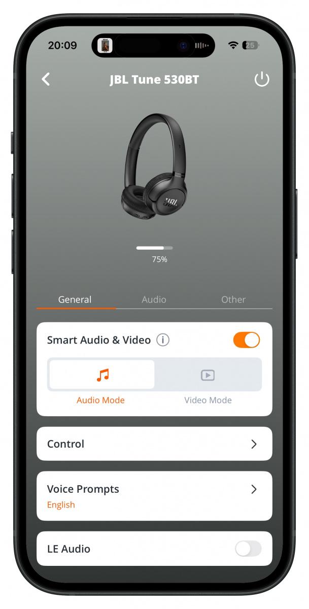 Sluchátka pracují s aplikací JBL Headphones. Ta je velmi přehledná. Na úvodní obrazovce vidíme připojená sluchátka s obrázkem i modelovým označením a úrovní baterie. V záložce General můžeme přepínat mezi režimy zvuku a videa, zobrazovat a měnit nastavení multifunkčního tlačítka, aktivovat hlasové povely a měnit jejich jazyk (čeština k dispozici není) nebo aktivovat LE Audio.