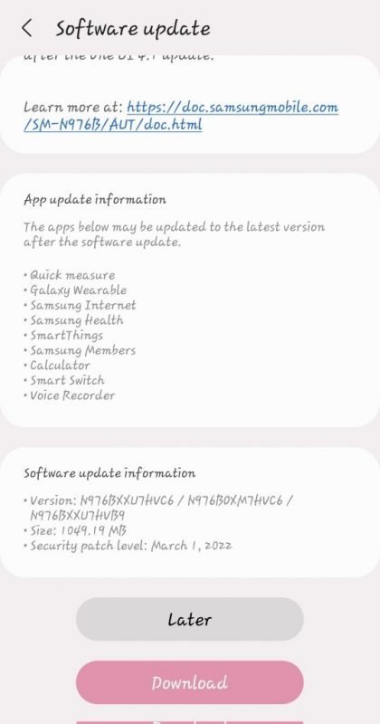 Aktualizace má něco málo přes jeden gigabajt (1,049 GB). Firmware s označením N976BXXU7HVC6 přináší celou řadu drobných změn pro aplikace od Samsungu a také březnové bezpečnostní záplaty. Update by měl postupně dorazit na všechny telefony z obou modelových řad, nicméně u smartphonů s označením Lite (Galaxy S10 Lite a Note 10 Lite) je dostupnost nejistá. Na redakční Note 10 a Galaxy S10e ještě nedorazil, stejně jako na Galaxy S20, na nějž se údajně šíří už od minulého týdne.