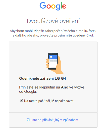 Tato výzva se bude objevovat vždy, kdykoliv se pokusíte přihlásit se ke svému Google účtu; je však možné nastavit vybraná zařízení jako důvěryhodná, na nichž se přihlášení obejde bez sekundárního kroku.